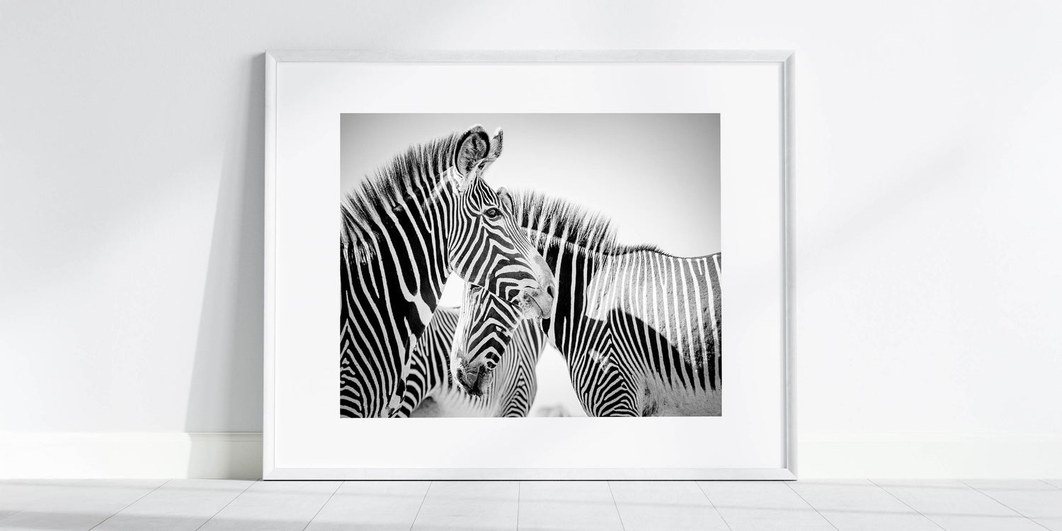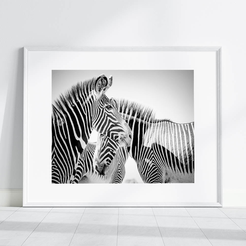 This Monochrome Zebra Duo artwork offers a refined and graceful way to bring the elegance of the wild into your home. Order now to enhance your decor with this stunning piece.