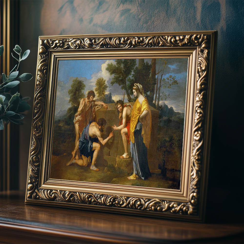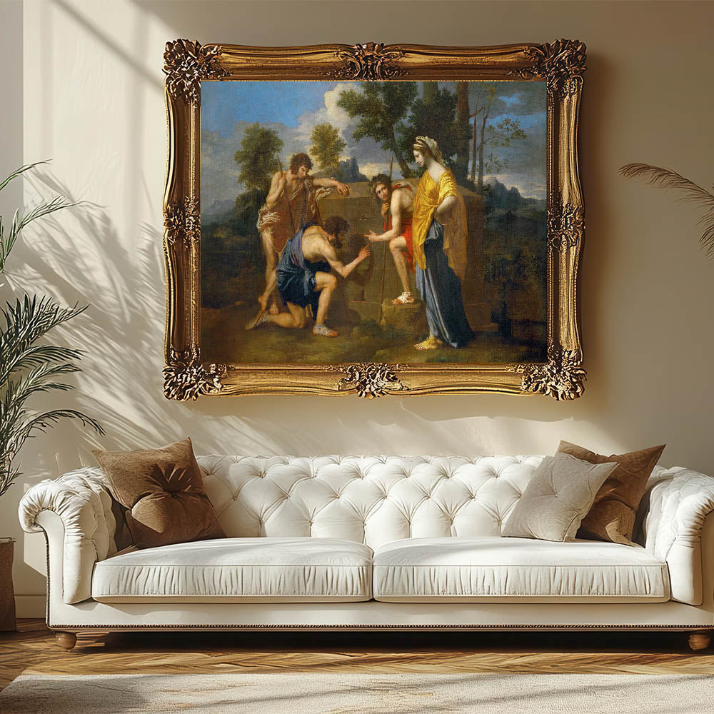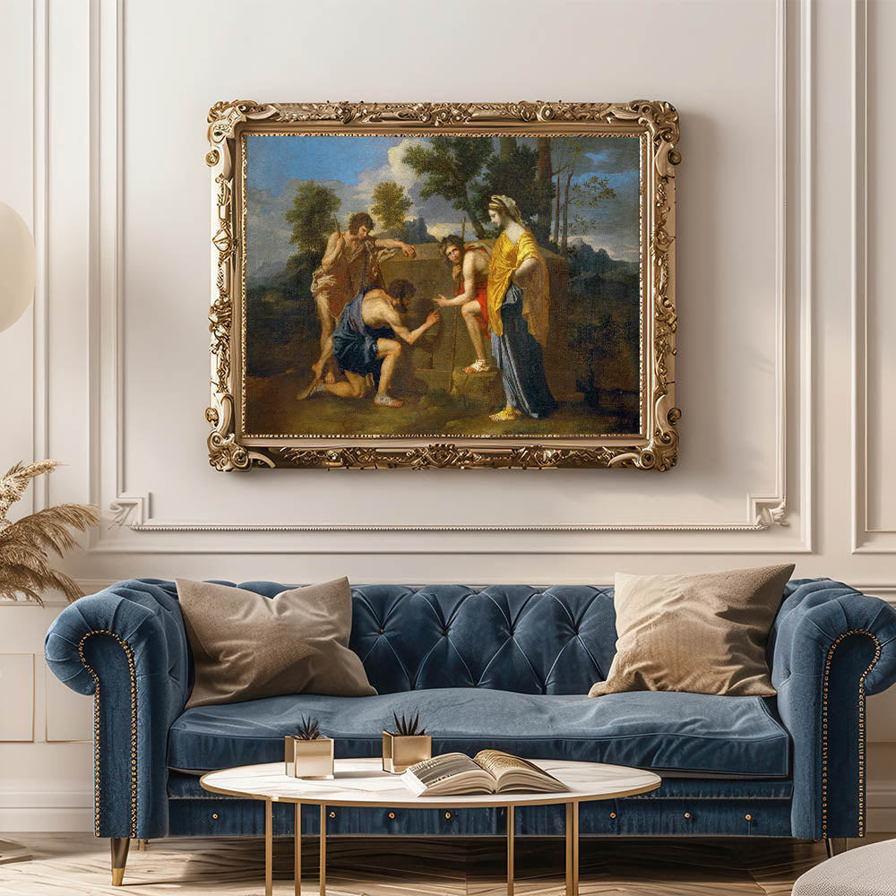 Bring the serene beauty of pastoral life into your home with this Baroque pastoral scene art print. This stunning piece of artwork depicts a group of figures, each engaged in a moment of contemplation and conversation in a natural setting. The muted color palette, flowing garments, and rustic landscape convey a timeless charm that evokes the pastoral simplicity of classical themes.