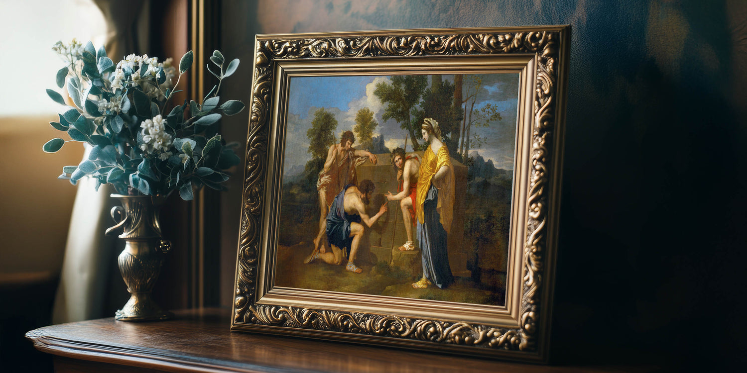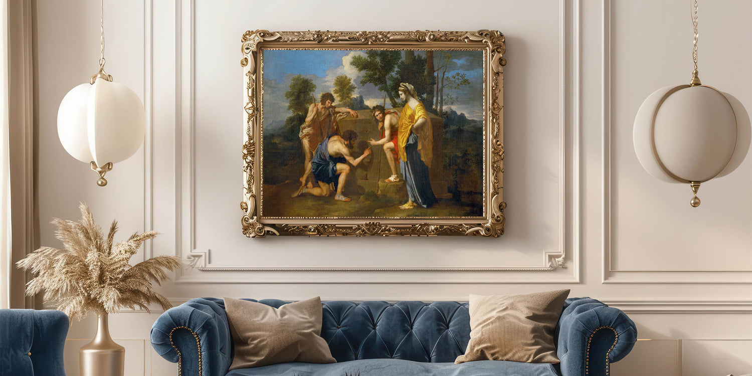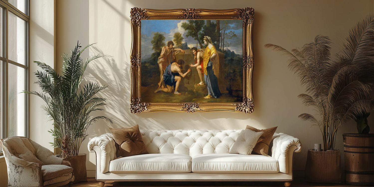 Bring the serene beauty of pastoral life into your home with this Baroque pastoral scene art print. This stunning piece of artwork depicts a group of figures, each engaged in a moment of contemplation and conversation in a natural setting. The muted color palette, flowing garments, and rustic landscape convey a timeless charm that evokes the pastoral simplicity of classical themes.