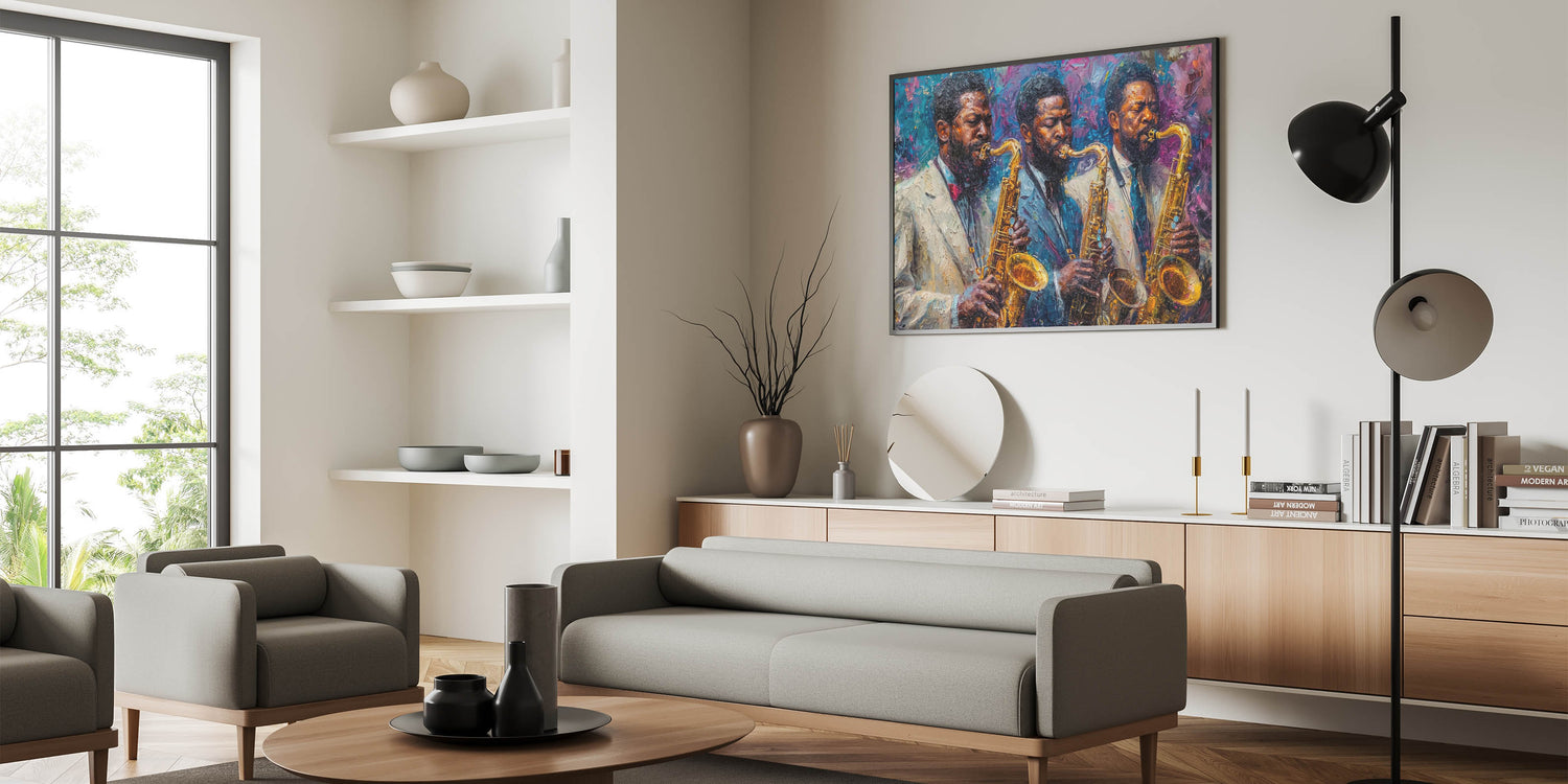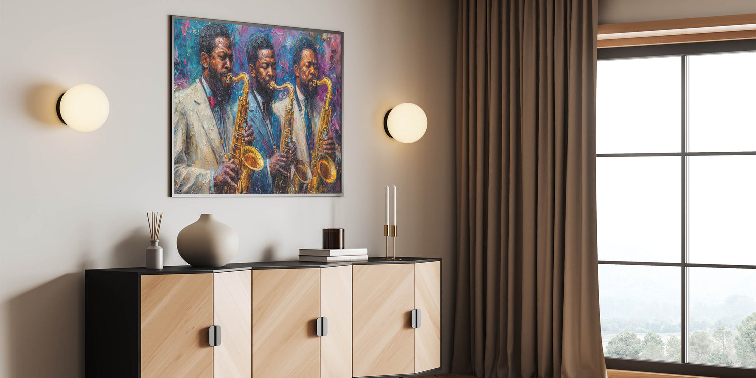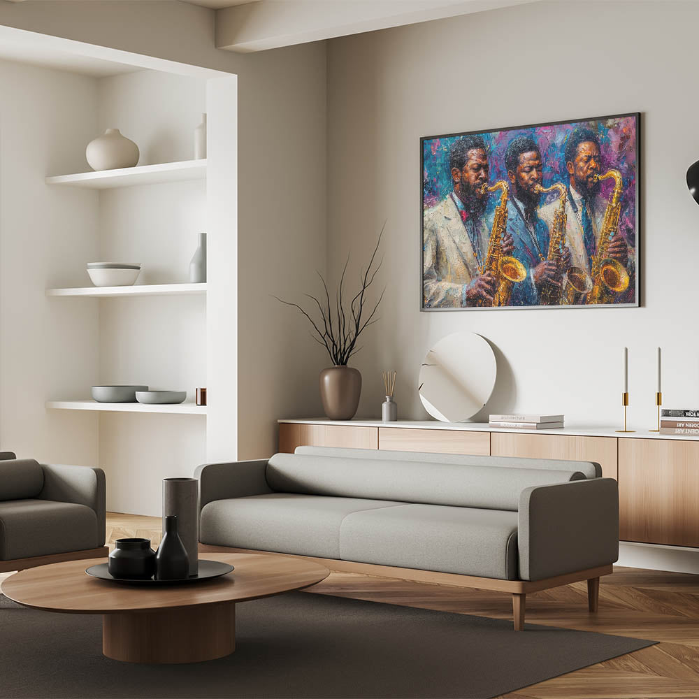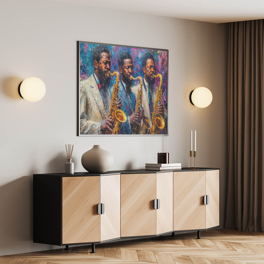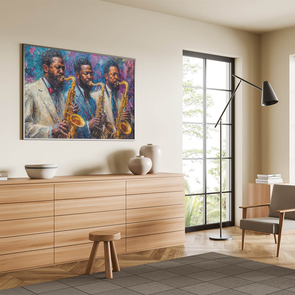 Immerse yourself in the vibrant world of jazz with our "Dynamic Figurative Abstract Wall Art - Jazz Saxophonists in Harmony." This stunning artwork captures three saxophonists in the midst of a soulful performance, rendered in bold, expressive strokes and rich colors. The textured details and dynamic composition bring the energy and passion of live jazz music to life, making it a perfect addition for music lovers and art enthusiasts alike.