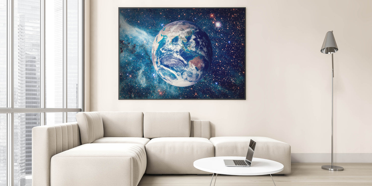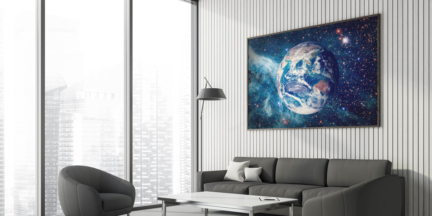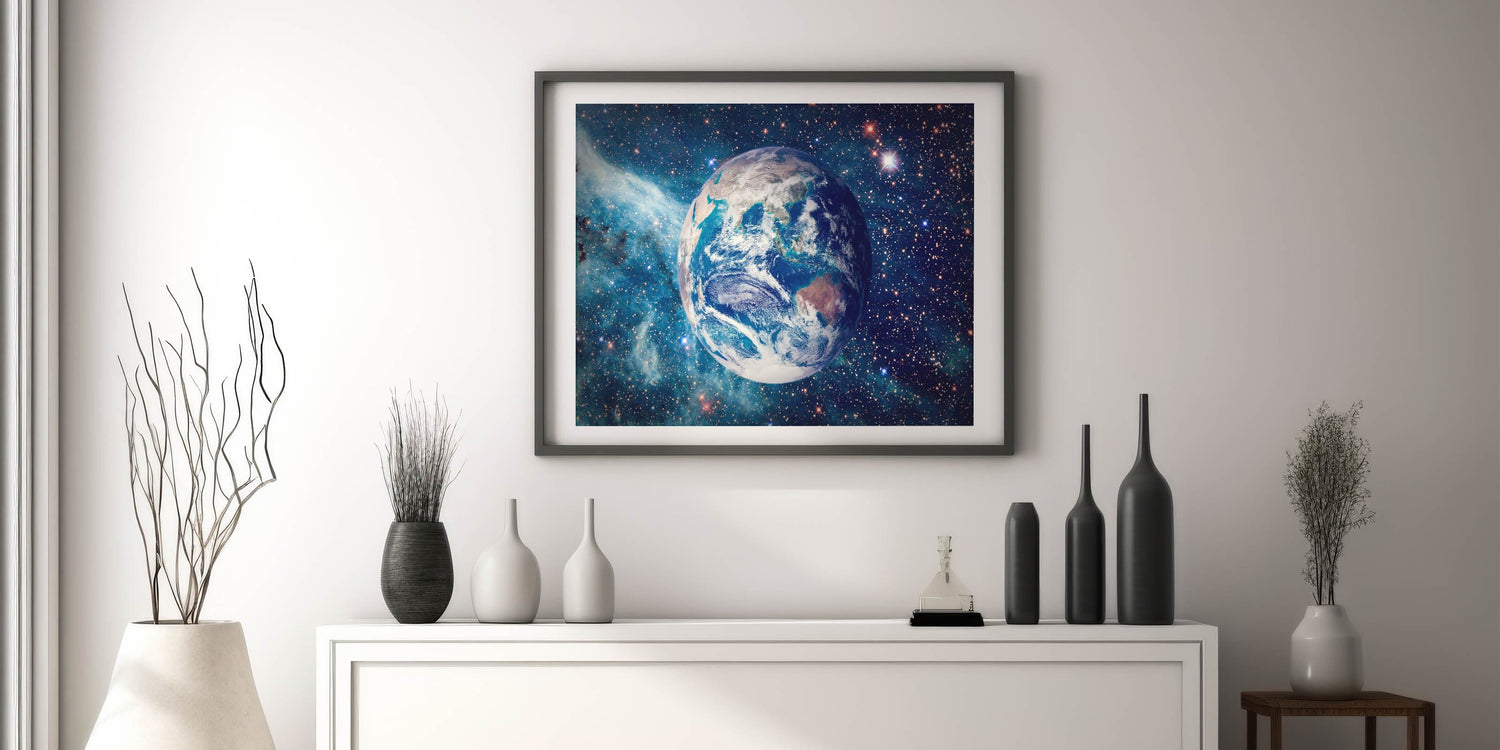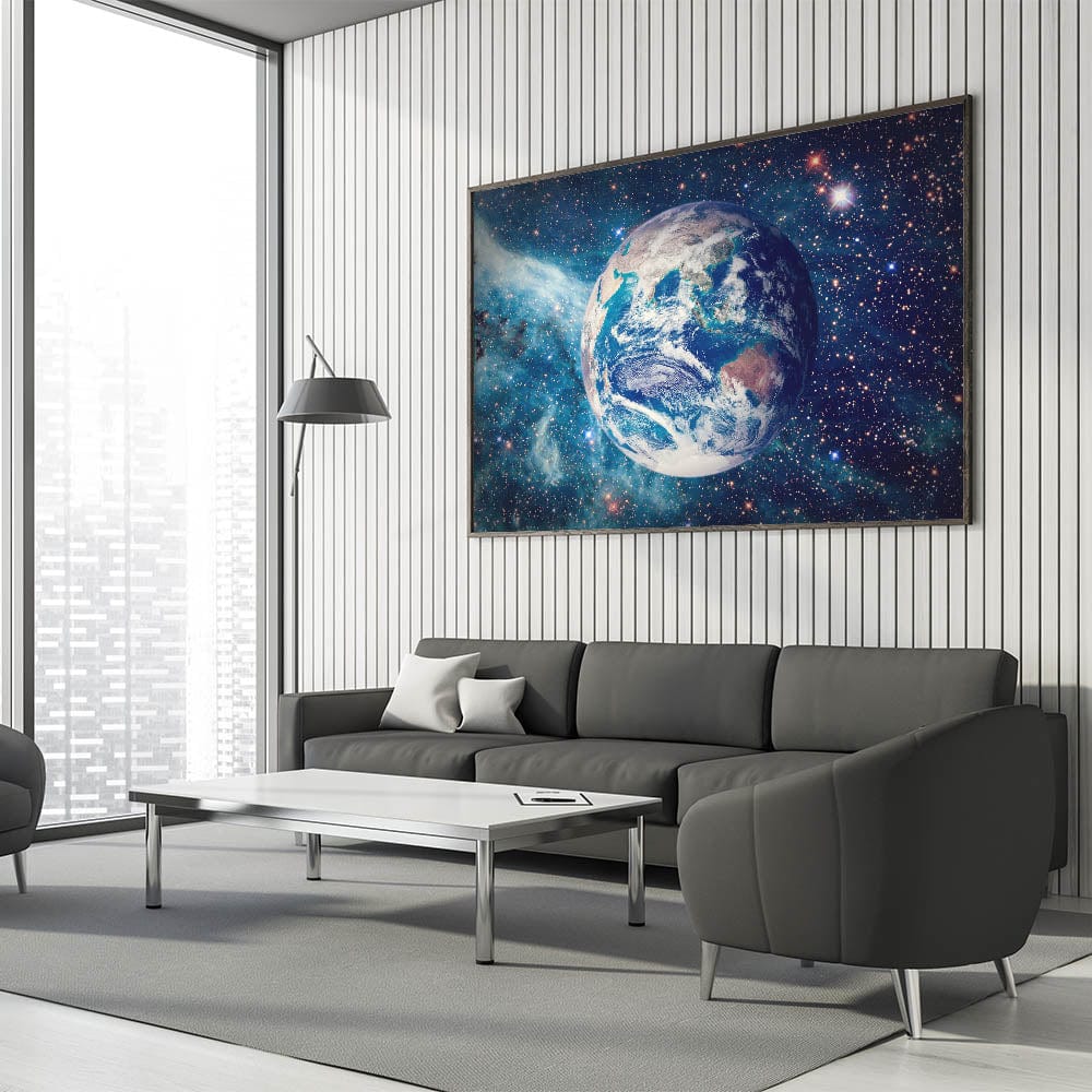 This captivating artwork brings together the wonder of space and the beauty of Earth, making it an ideal centerpiece for any home or office. Let this vivid cosmic view inspire and uplift your space.
