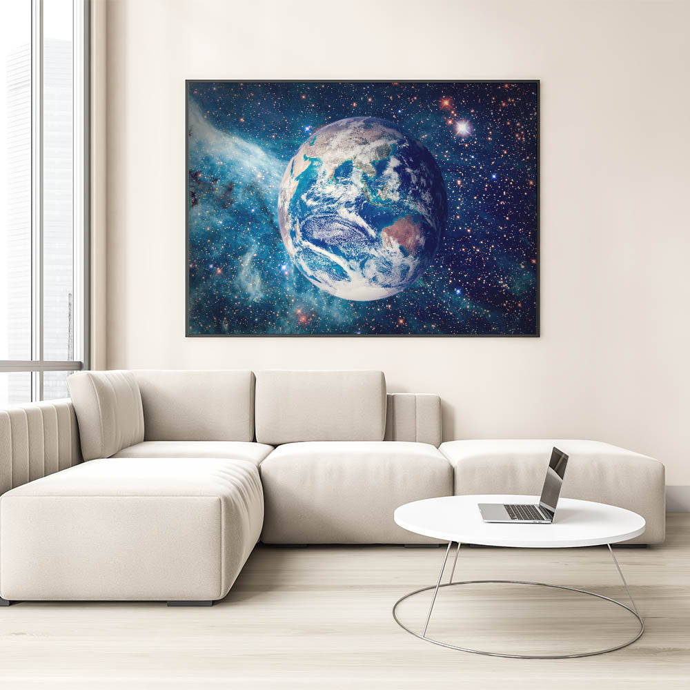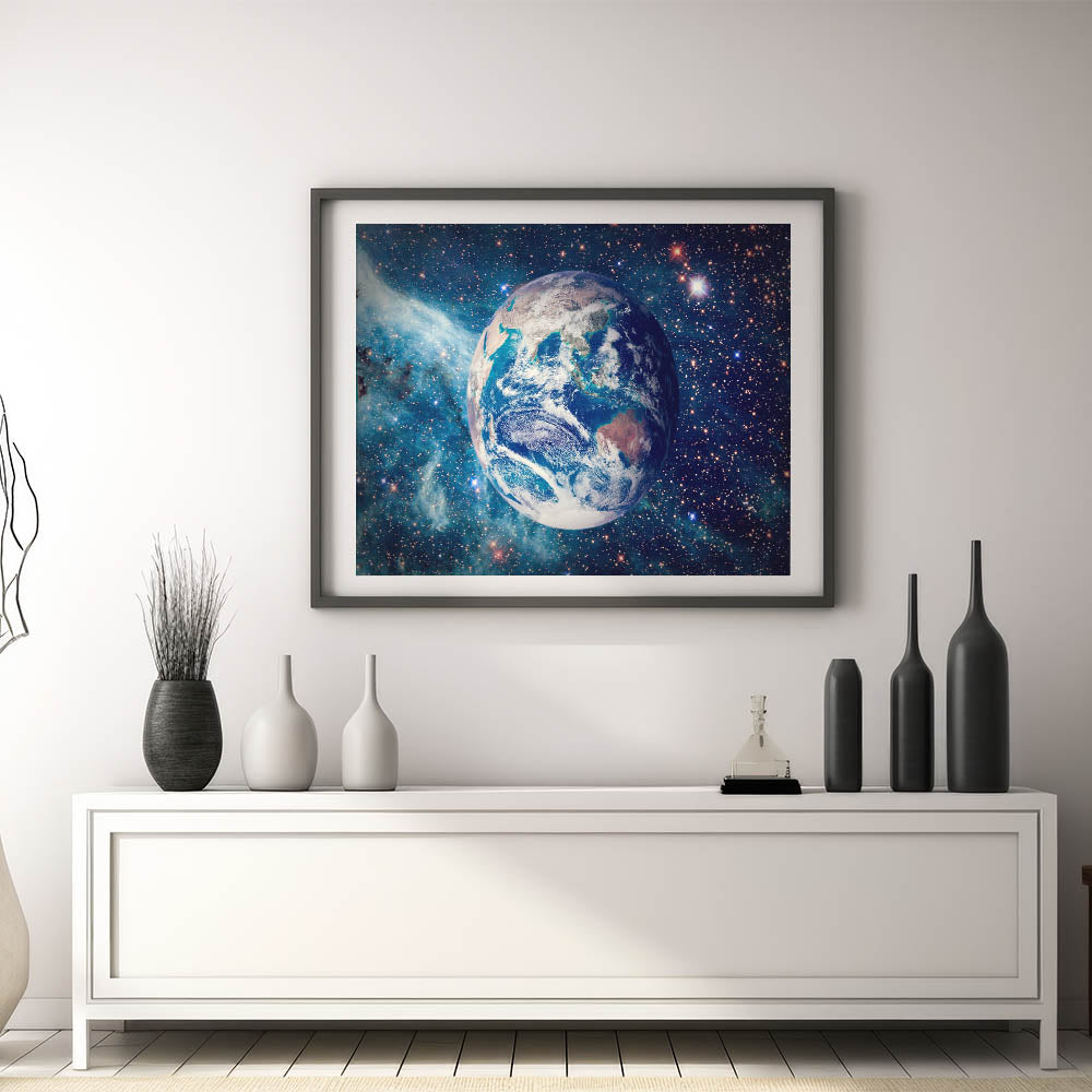 This stunning wall art captures a vibrant view of Earth, suspended in a sea of stars and cosmic light. The high-resolution image showcases the deep blues and greens of our planet, contrasted beautifully against the glowing stars of the universe. Perfect for space enthusiasts, nature lovers, and those seeking a global perspective, this celestial piece will add depth and beauty to any room.