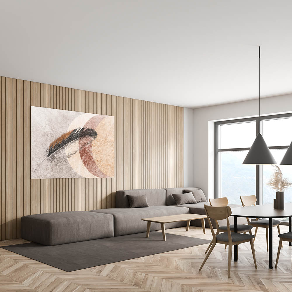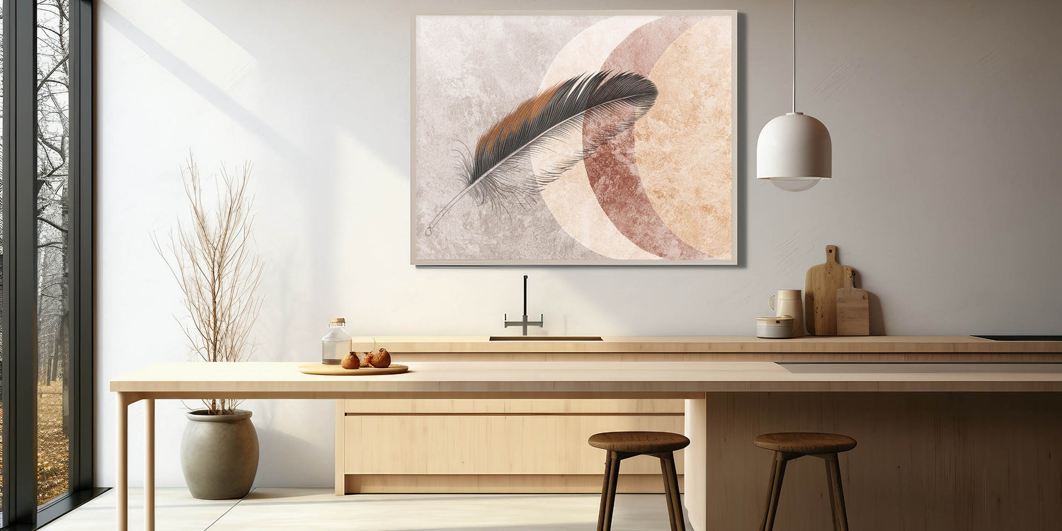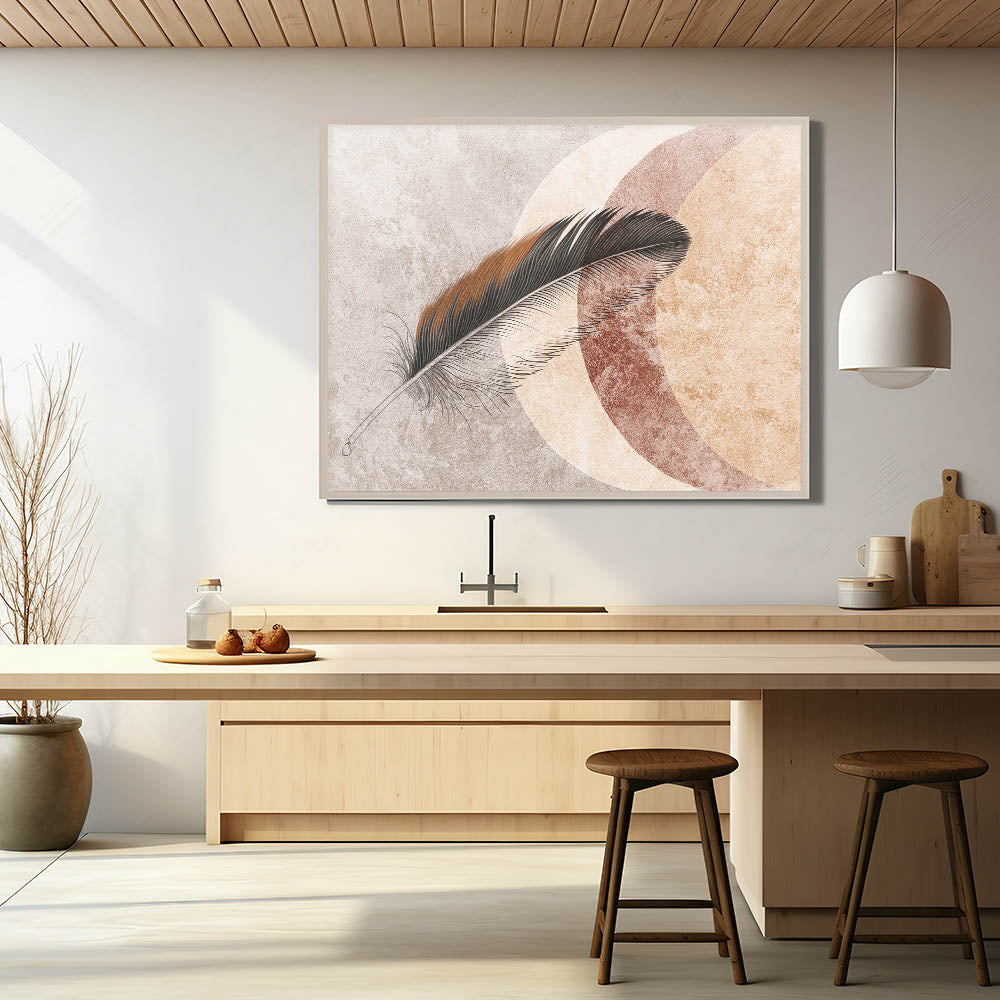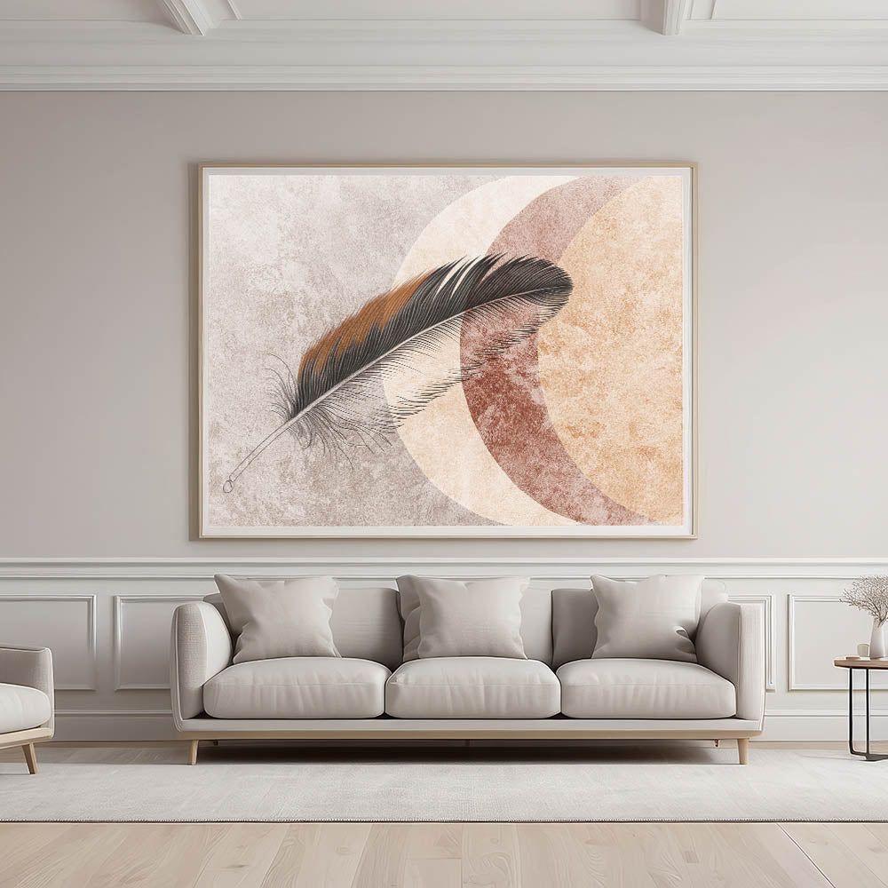 Enhance your interior with the sophisticated charm of our Elegant Feather and Arcs Abstract Art. This modern brush strokes canvas showcases a detailed feather paired with layered arcs in earthy tones of beige, brown, and rust. The harmonious combination of natural elements and abstract forms creates a visually compelling piece that is perfect for contemporary and minimalist spaces.