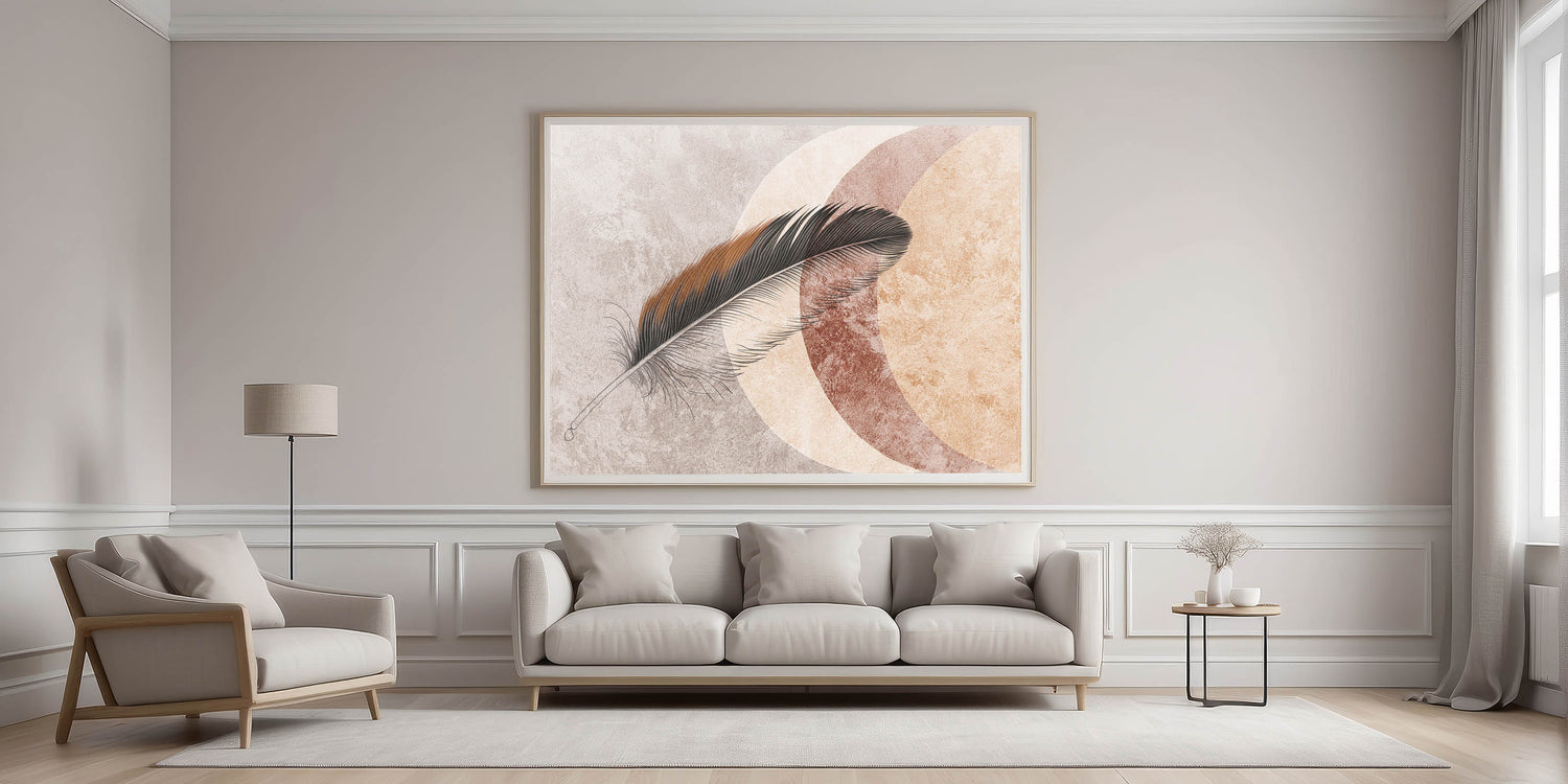 Infuse your decor with the refined elegance of this abstract artwork. The intricate feather detailing, coupled with the soft, textured arcs, adds depth and character to any room. Whether you choose the framed version for a polished look or the stretched canvas for a modern aesthetic, this piece will be a distinctive addition to your home or office.