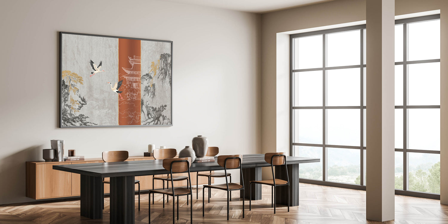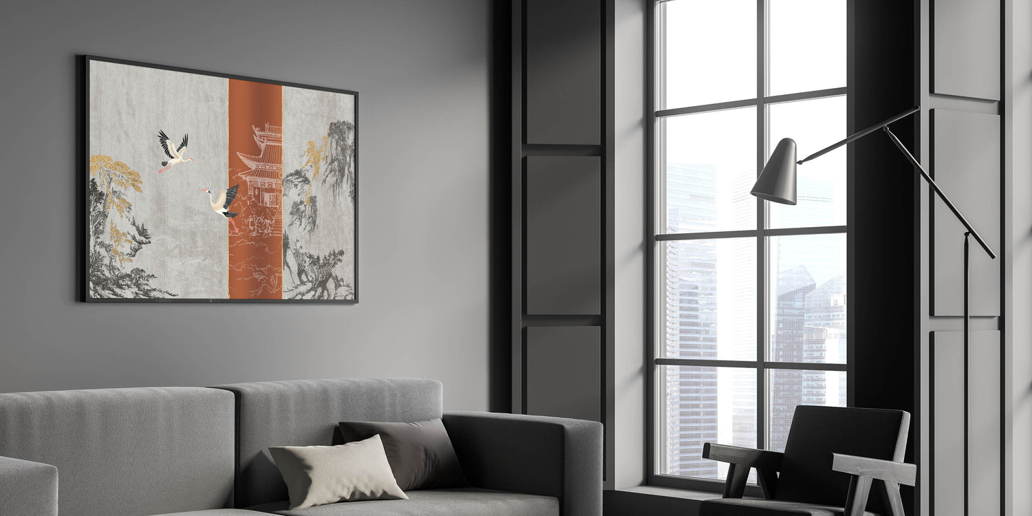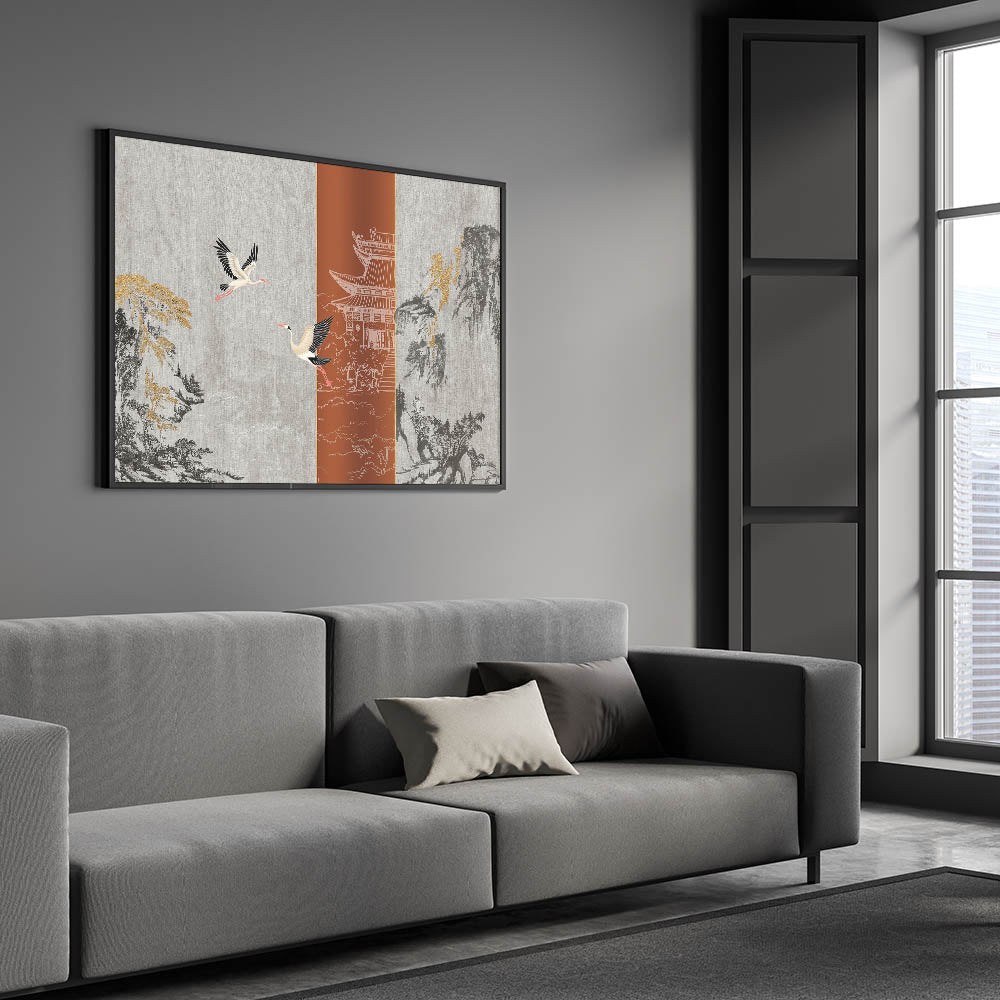 Enhance your interior with this elegant Strokes and Lines Abstract Art. This artwork features a beautiful blend of dynamic strokes and intricate line patterns, capturing a serene scene with flying cranes and traditional architectural elements. The detailed design and harmonious color palette make it a perfect addition to any contemporary or classic decor.