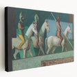 Immerse yourself in the structured elegance of Riders in Formation by Cyprián Majerník, an Expressionist artwork that merges abstraction with disciplined composition. The painting features a line of riders on white horses set against a striking green and blue backdrop, punctuated with vibrant reds and yellows. The bold geometry and expressive strokes convey movement and unity, making this piece a striking addition to any art collection.