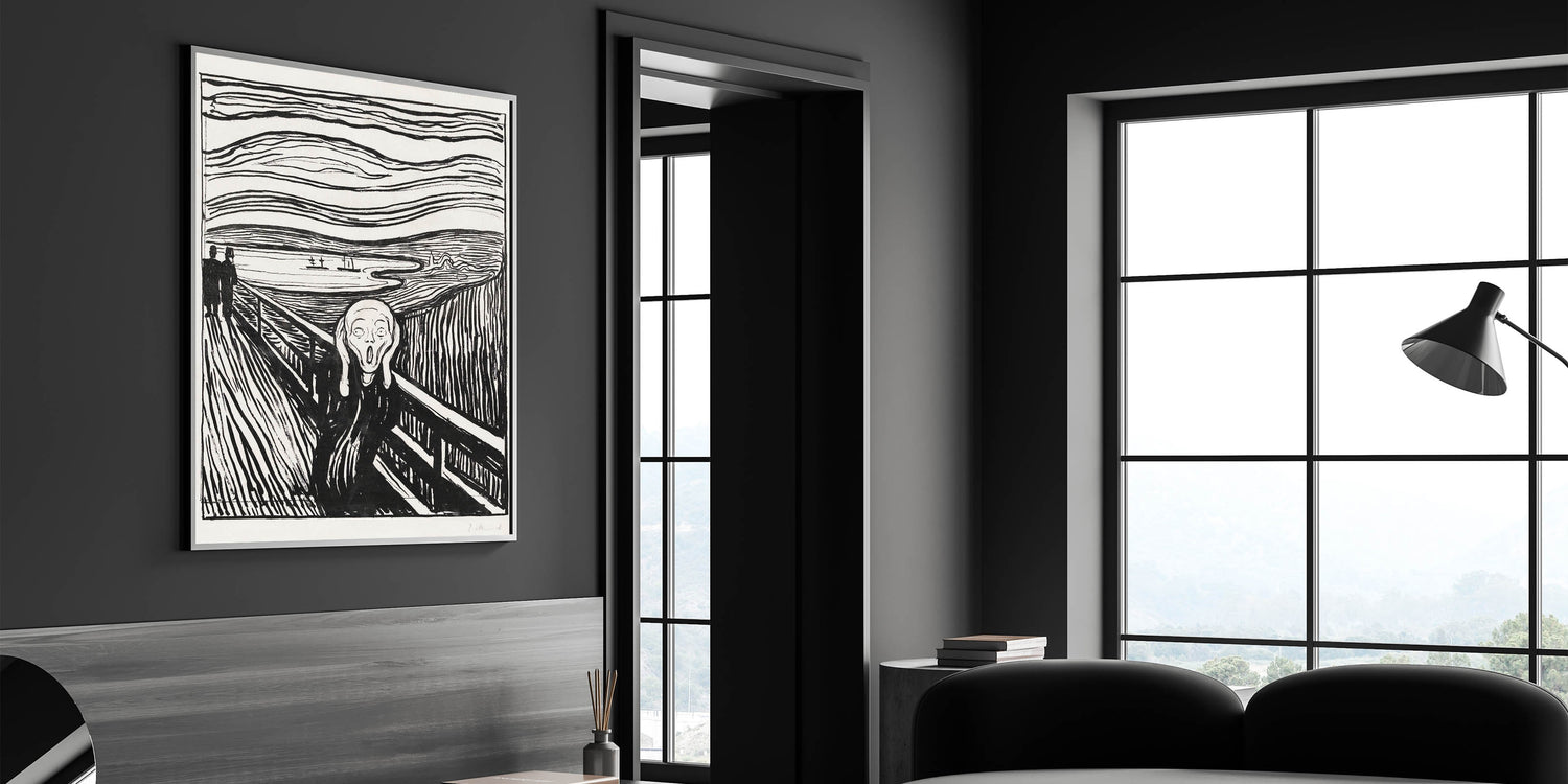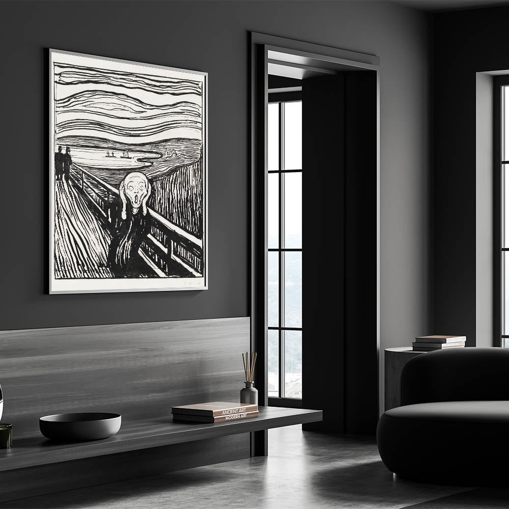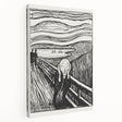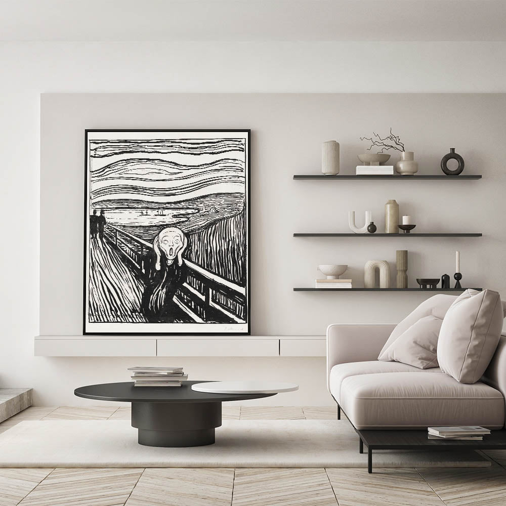 Own a piece of art history with Edvard Munch's "The Scream, a timeless Expressionist masterpiece from 1895. This black-and-white woodcut version of Munch’s iconic artwork captures the raw emotion and existential angst that has resonated with audiences for over a century. The bold, undulating lines of the sky and landscape create a sense of chaos and despair, perfectly framing the central figure’s haunting expression. The Scream" is not just an artwork—it’s a universal symbol of human emotion and a powerful centerpiece for any collection.