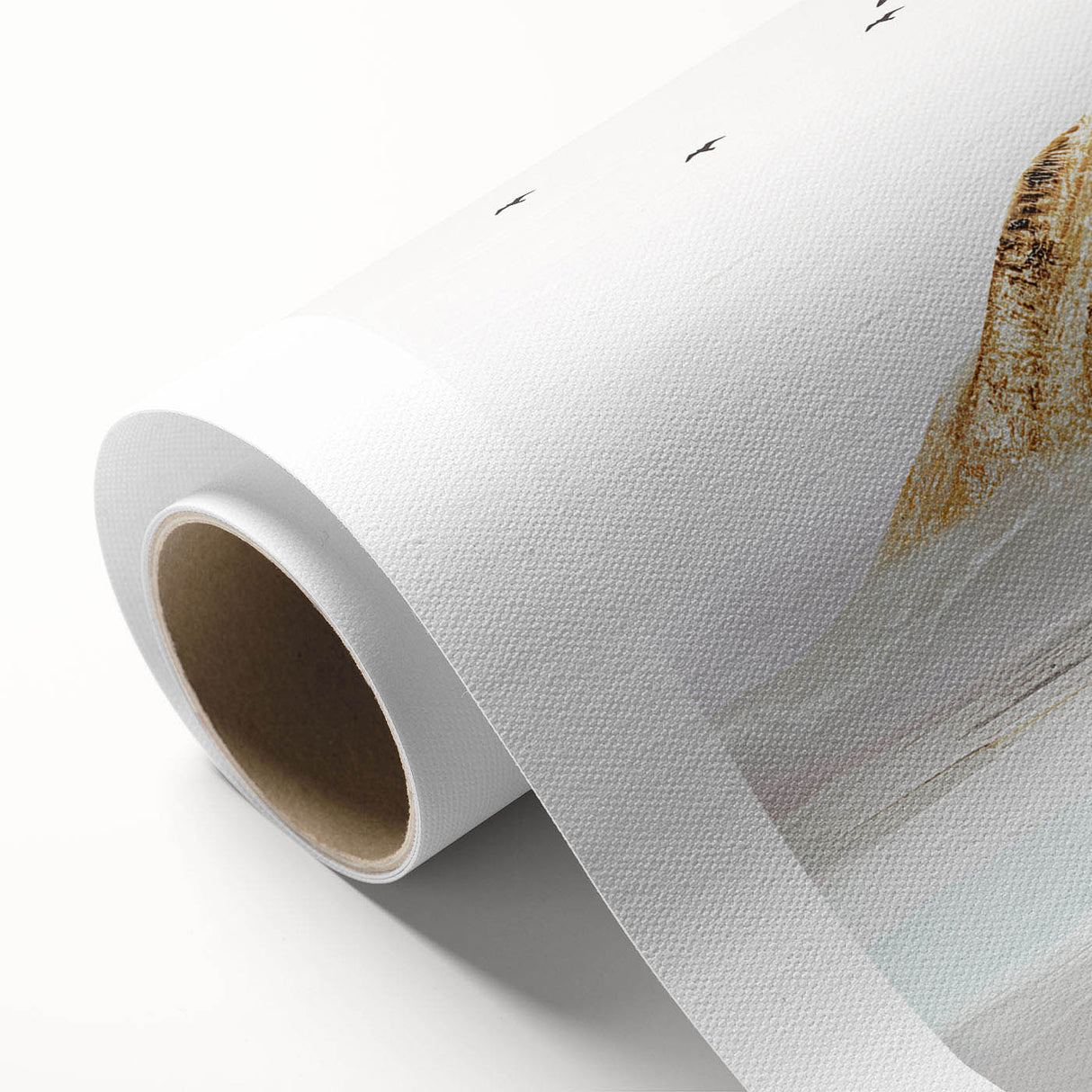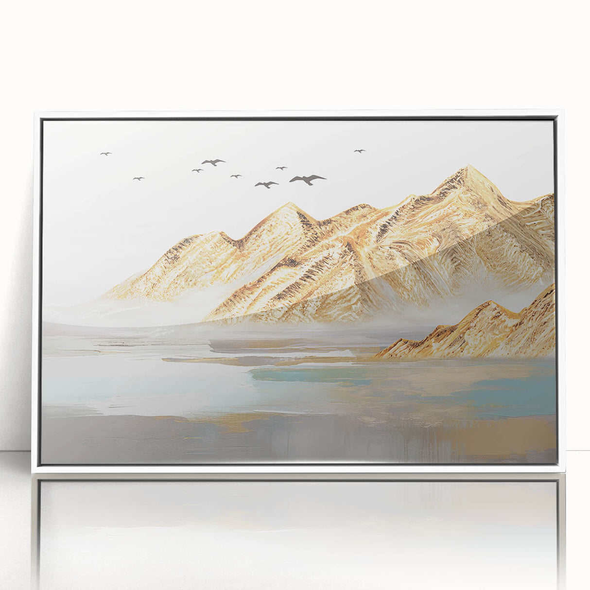 Transform your space with this stunning Golden Mountain Landscape Abstract Art, a breathtaking fusion of natural beauty and contemporary design. This piece showcases a majestic mountain range bathed in warm golden hues, accented by subtle brush strokes and geometric patterns. The serene background and soaring birds add a touch of tranquility, making this artwork an ideal centerpiece for any room.