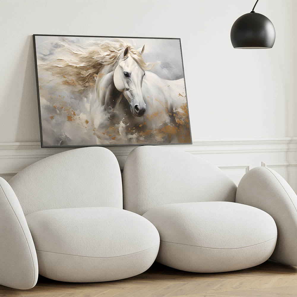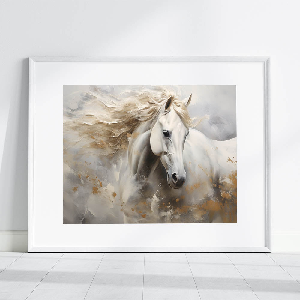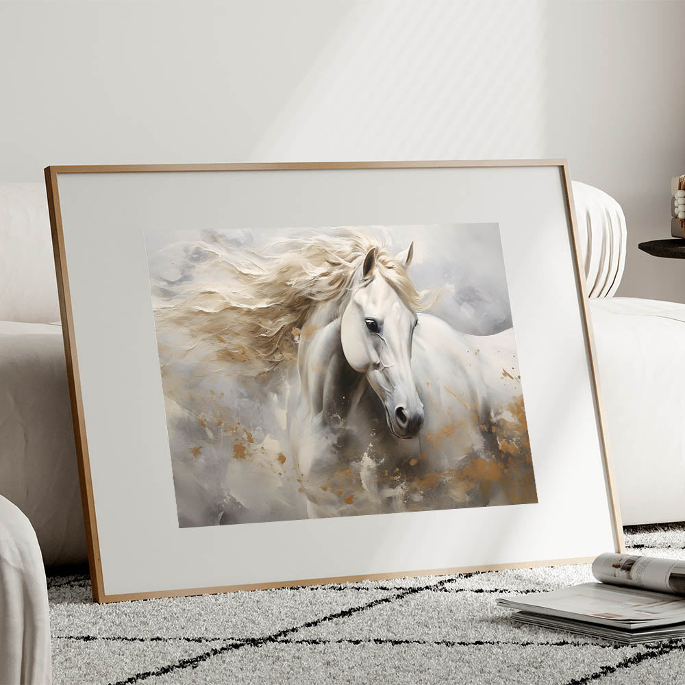 Add a touch of ethereal beauty to your space with this stunning white horse wall art, showcasing the elegance and grace of a majestic horse in motion. The soft brushstrokes and delicate color palette create a serene and captivating atmosphere, perfect for enhancing any room with a sense of calm and refinement.