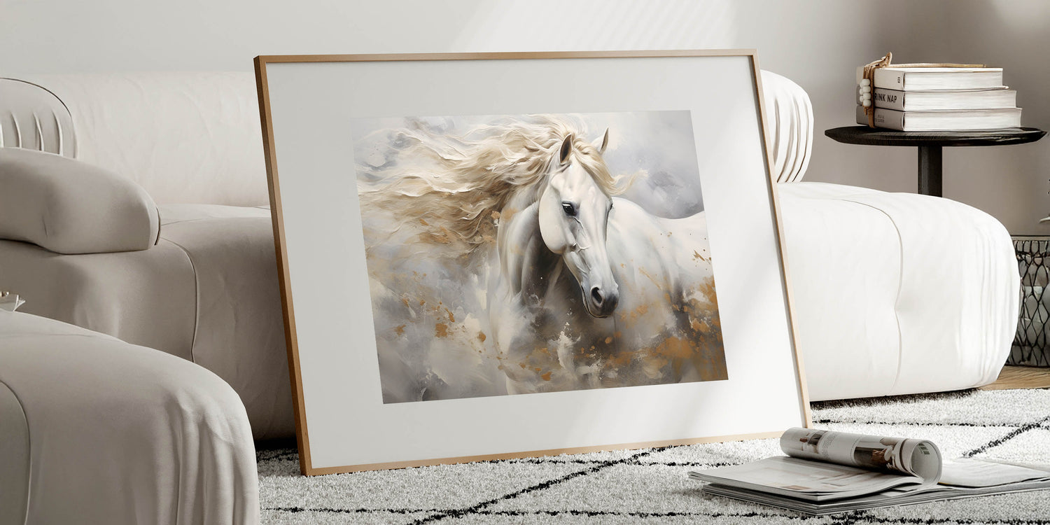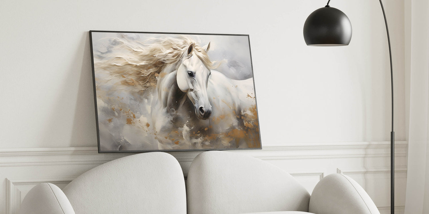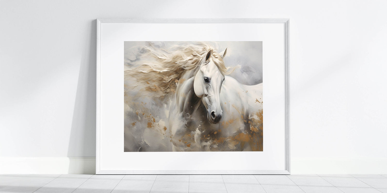 Add a touch of ethereal beauty to your space with this stunning white horse wall art, showcasing the elegance and grace of a majestic horse in motion. The soft brushstrokes and delicate color palette create a serene and captivating atmosphere, perfect for enhancing any room with a sense of calm and refinement.