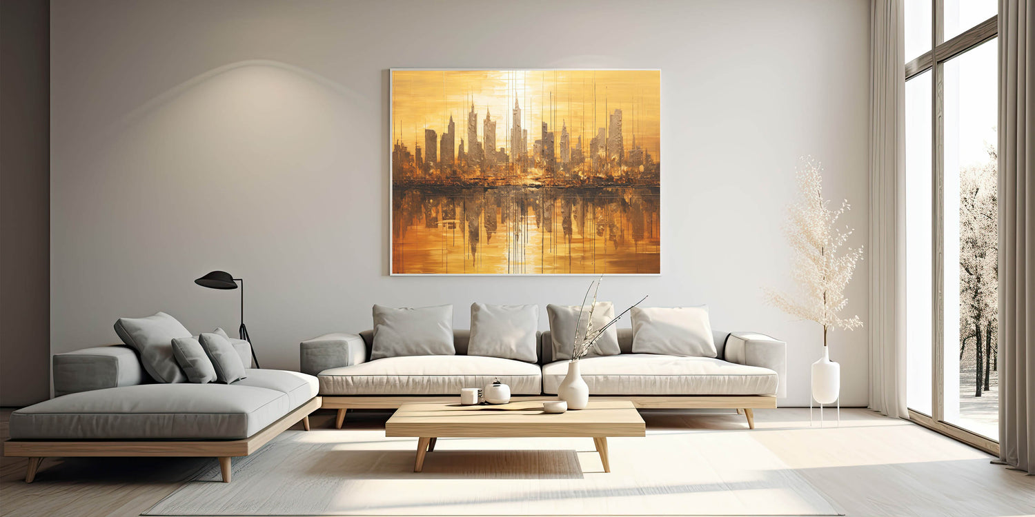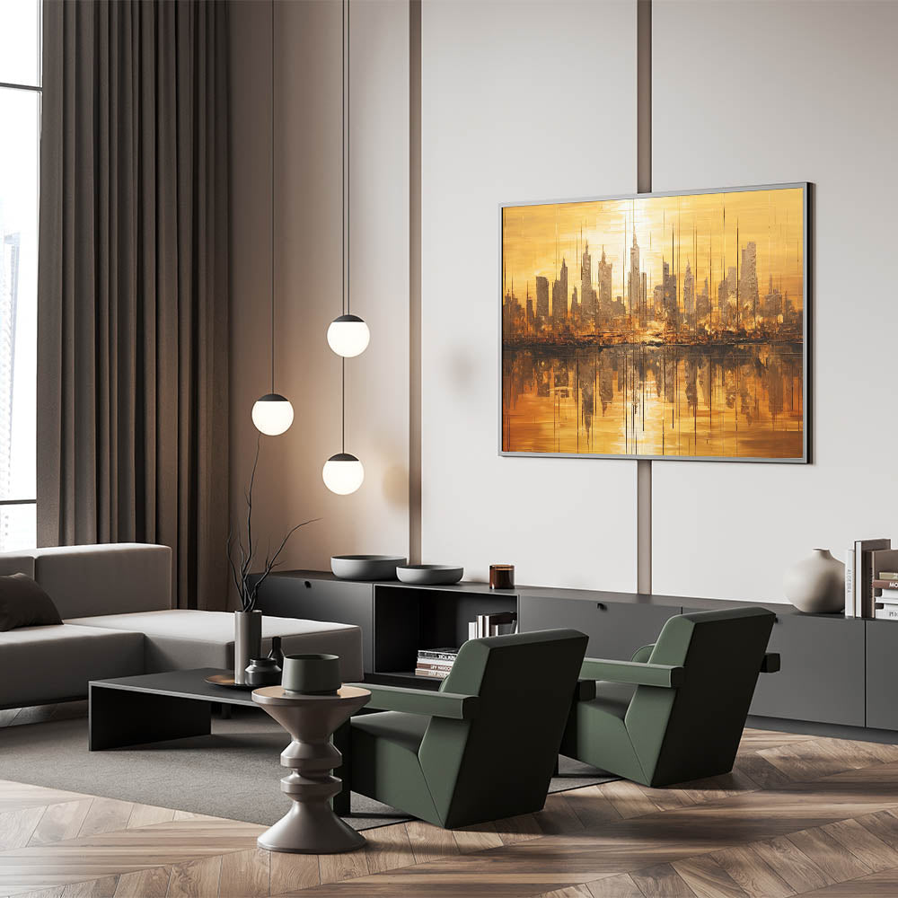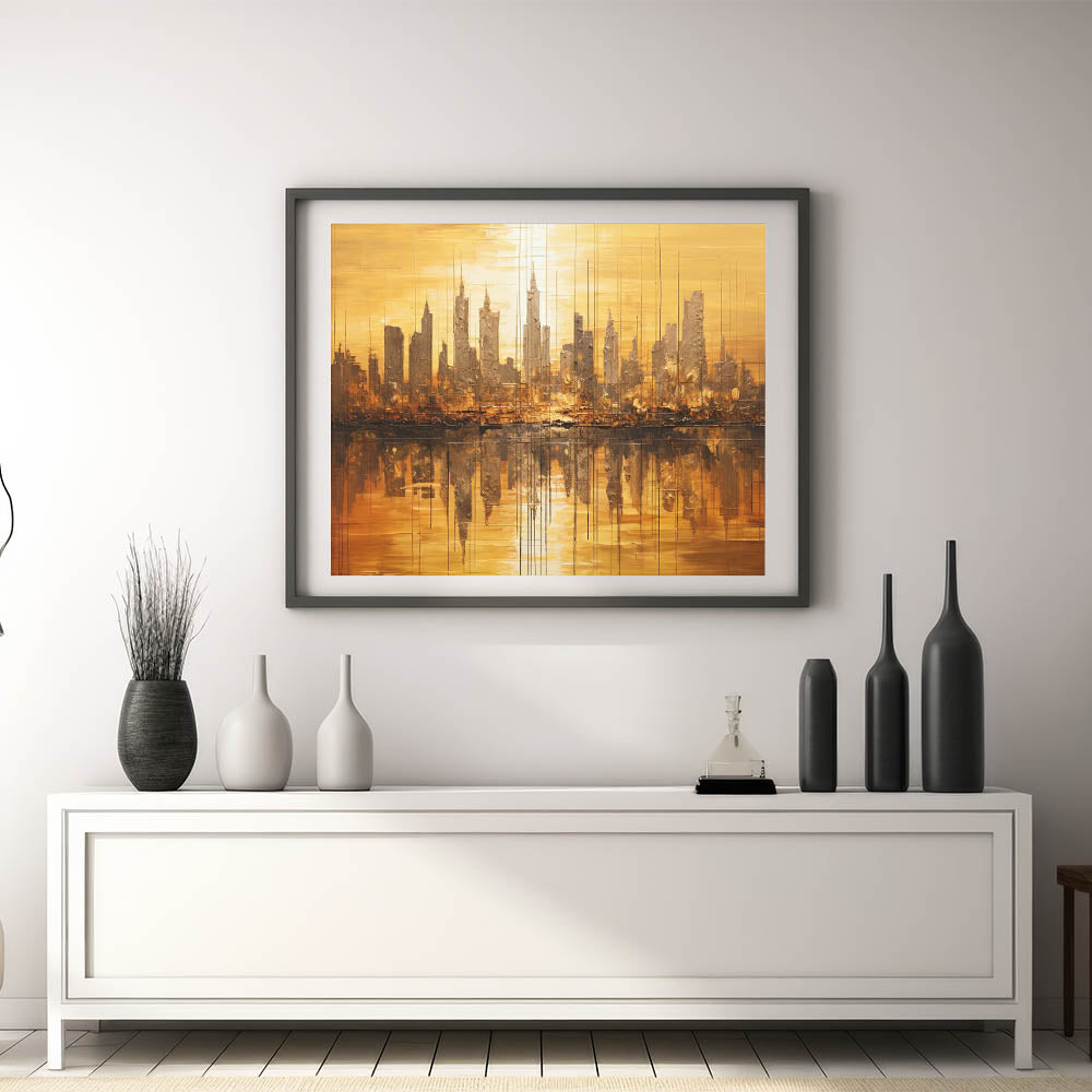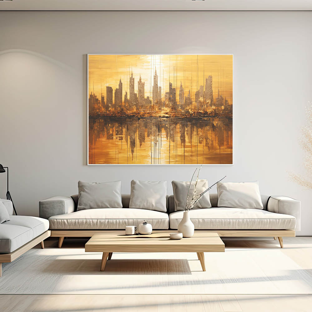 Enhance your space with this striking golden abstract cityscape art, featuring a modern skyline that captures the essence of urban sophistication. This piece is perfect for adding a warm, contemporary touch to any room.