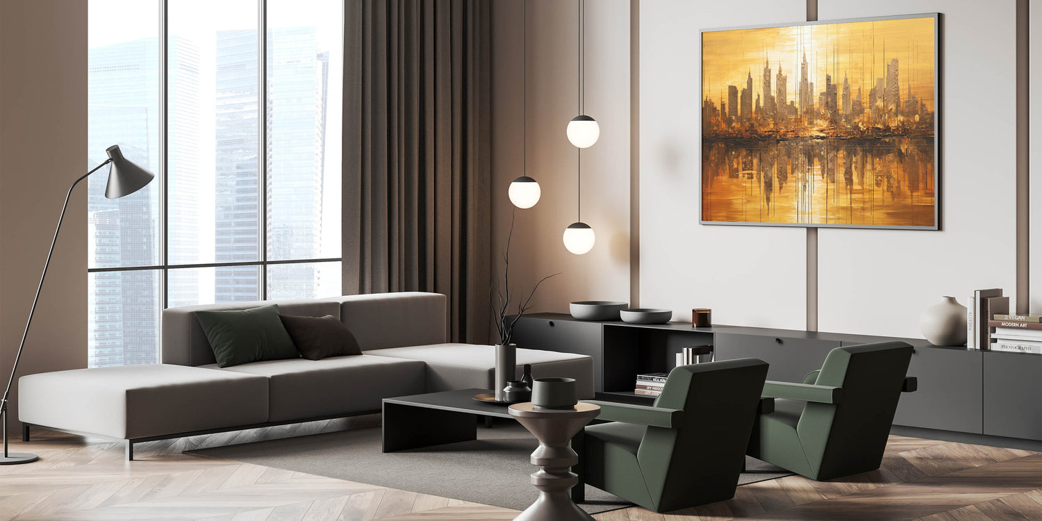 This abstract cityscape art is an ideal choice for anyone looking to bring a touch of elegance and warmth to their home or office. With its golden hues and urban aesthetic, it's sure to be a focal point in any space.