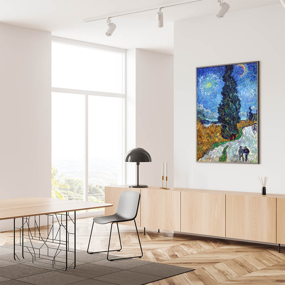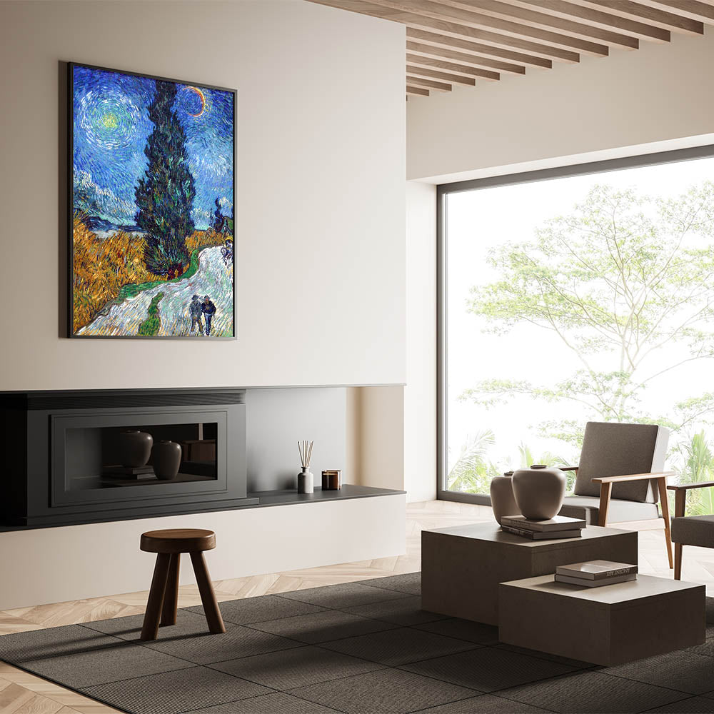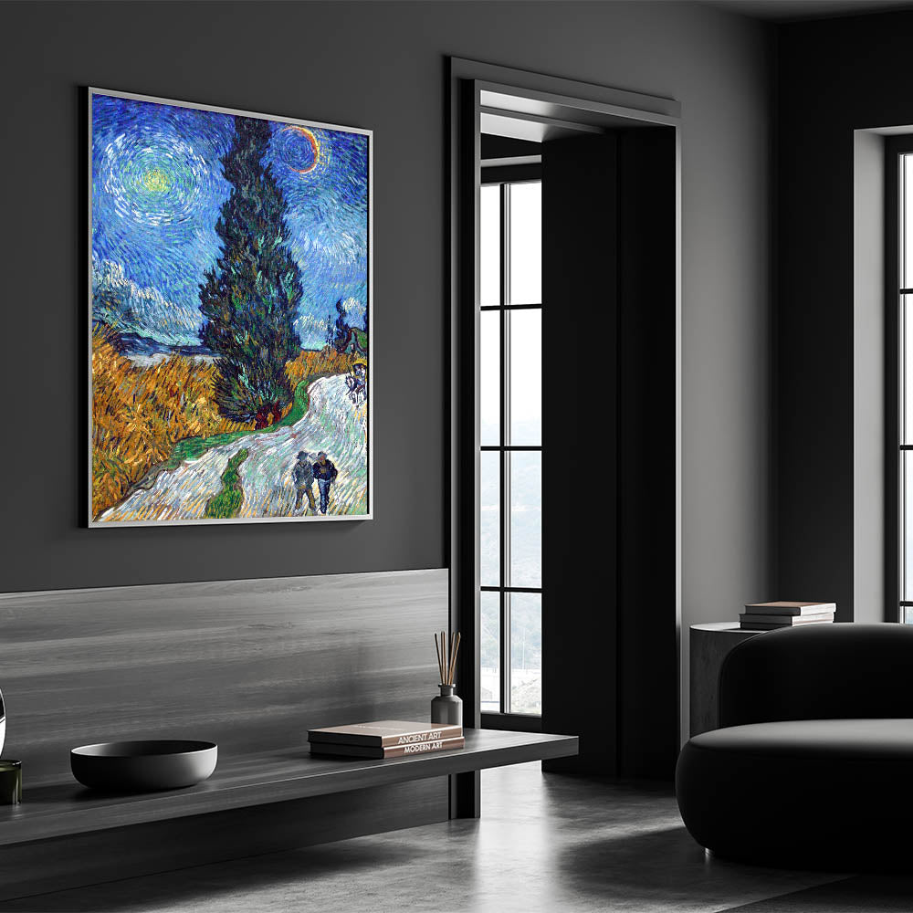 This Impressionist landscape transports viewers to a serene yet vibrant setting, where nature meets the cosmos. Ideal for art collectors and enthusiasts, "Road with Cypress and Star" brings an artistic sense of wonder and serenity to any home or office.