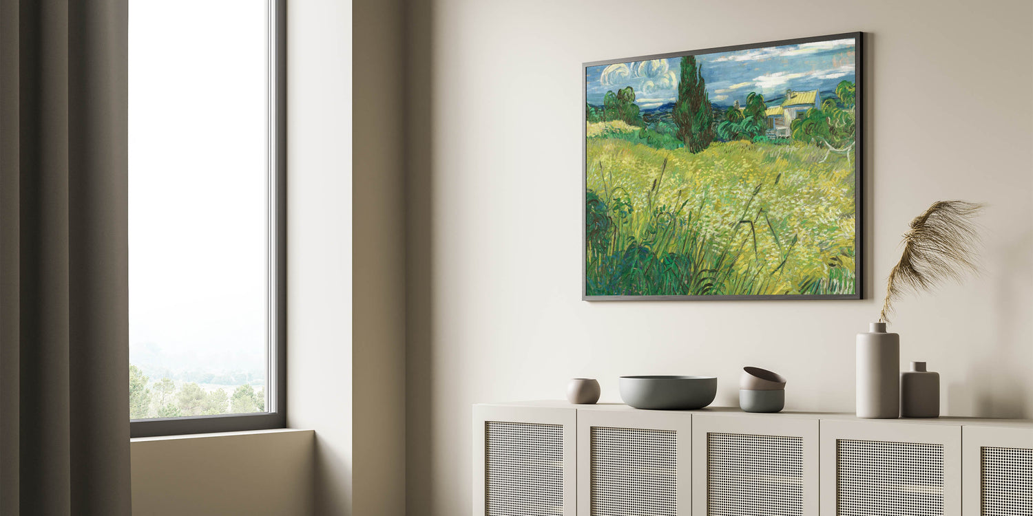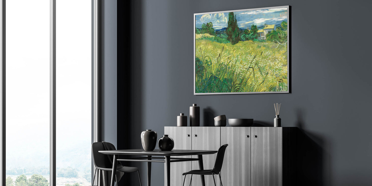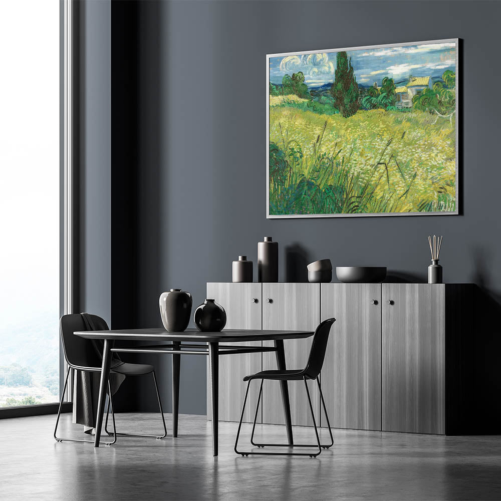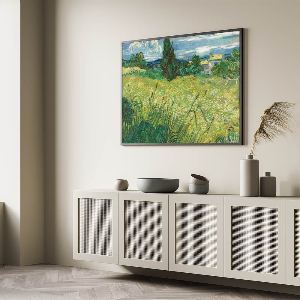 Immerse yourself in the serene beauty of the countryside with this Impressionist wall art inspired by Vincent van Gogh. This captivating painting showcases a vibrant green field with lush vegetation, a stately cypress tree, and a quaint farmhouse under a dynamic blue sky. The textured brushstrokes and vivid colors reflect van Gogh’s signature Impressionist style, evoking tranquility and rural charm.