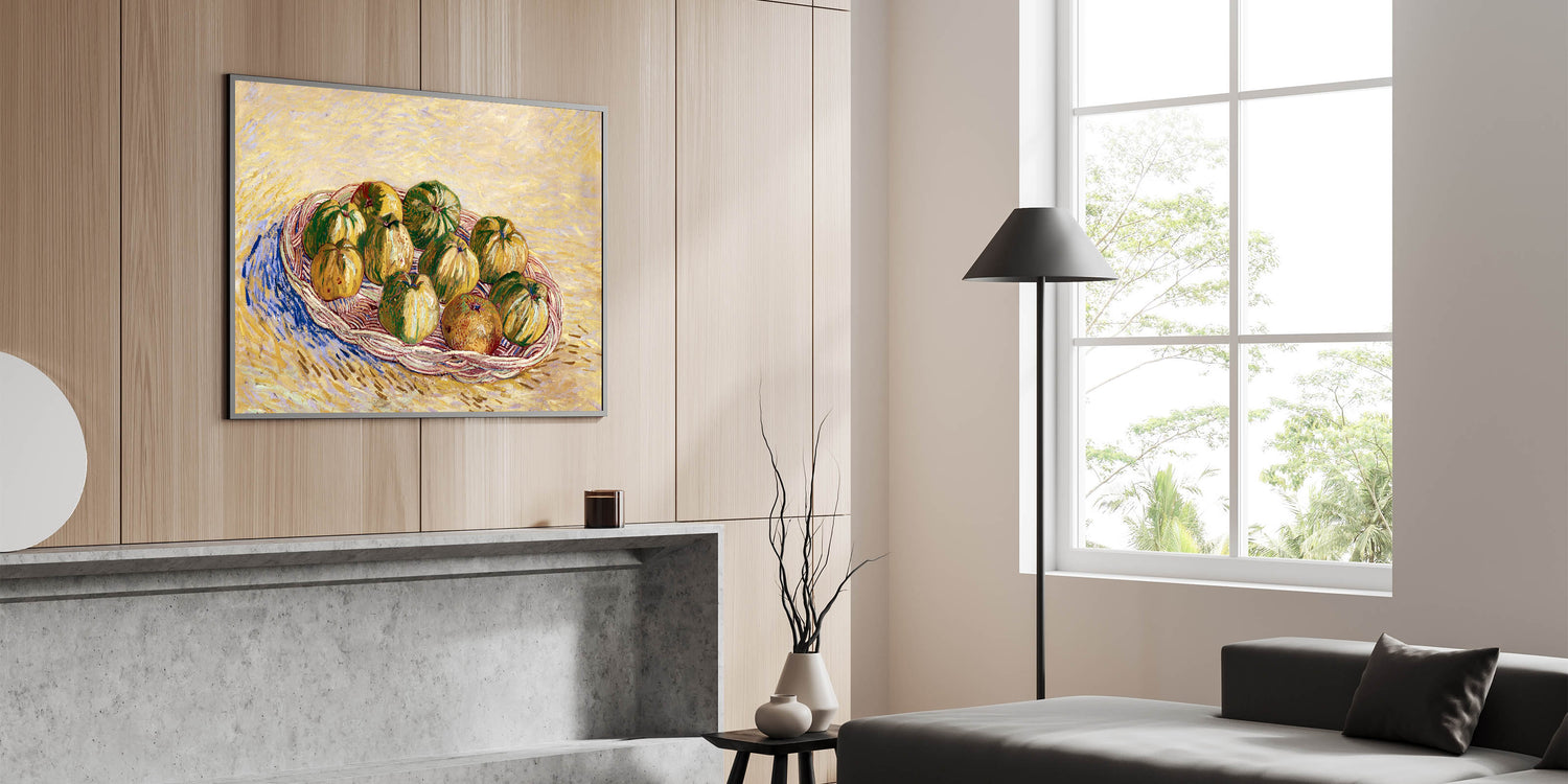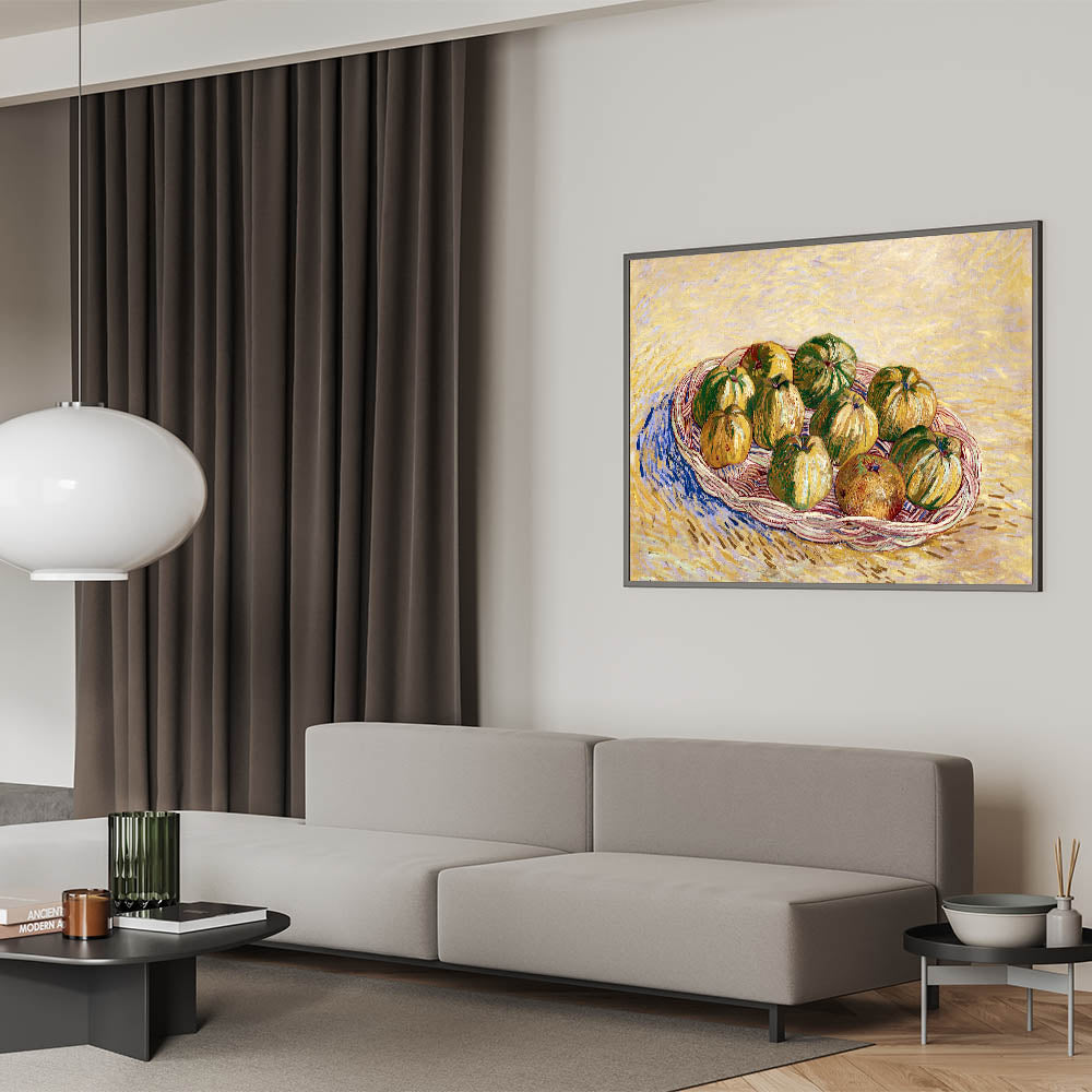 Add a touch of timeless elegance to your space with Vincent van Gogh's "Still Life, Basket of Apples" (1887). This exquisite Impressionist painting captures the simplicity and beauty of everyday life, featuring a woven basket filled with golden and green apples. Van Gogh’s distinctive brushstrokes and warm, earthy tones make this still life a captivating masterpiece.