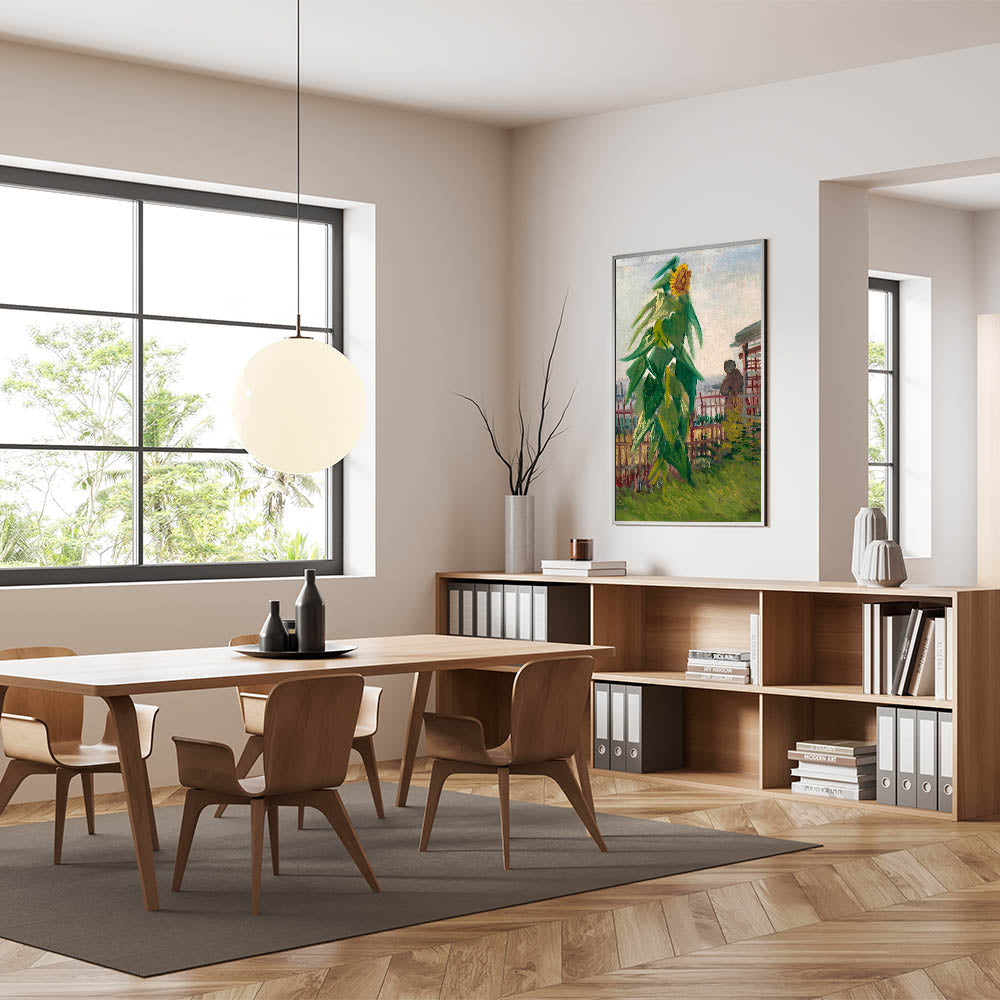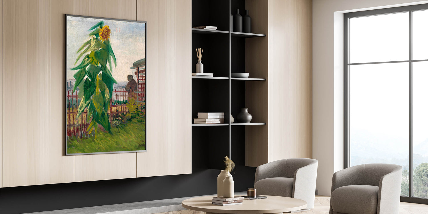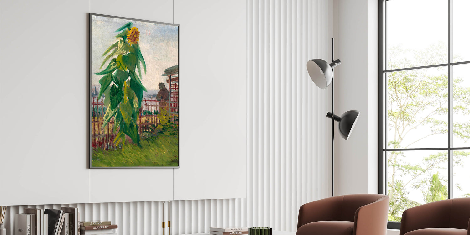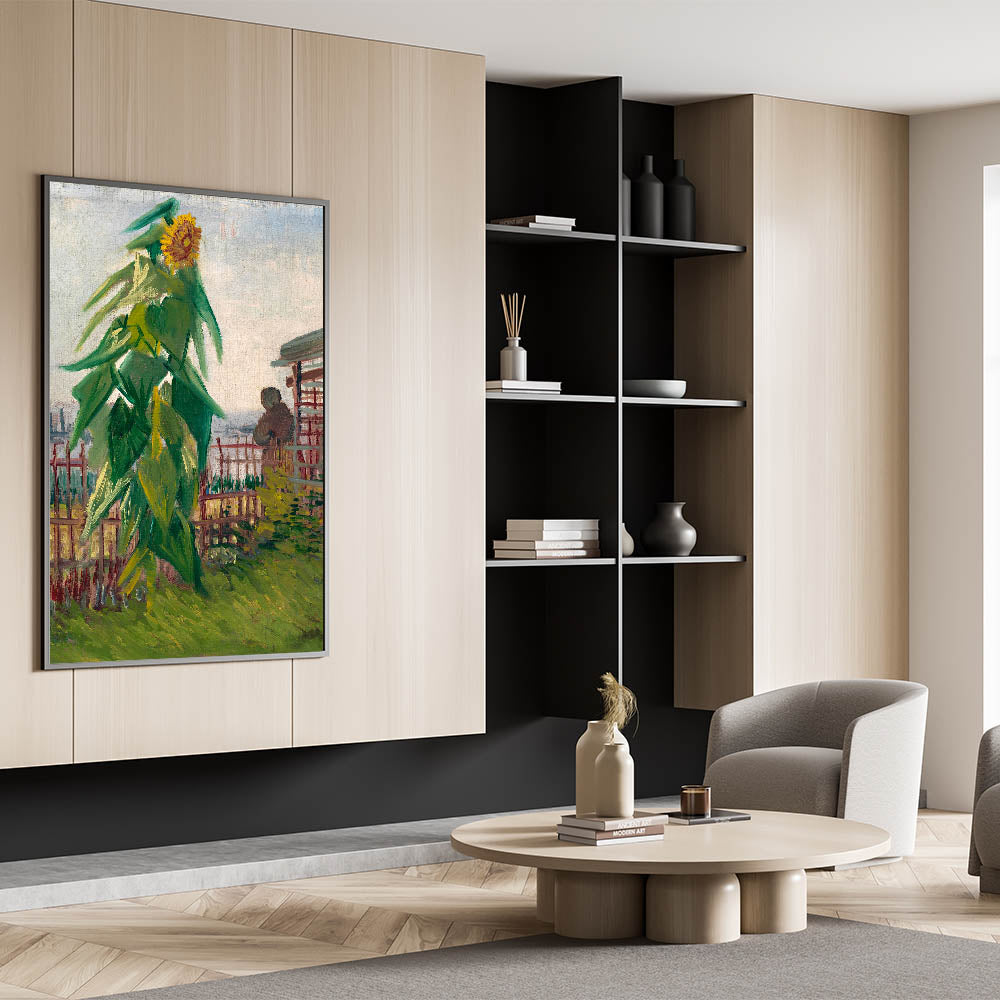 Bring the warmth of the countryside into your home with "Allotment with Sunflower" (1887) by Vincent van Gogh. This lively painting showcases Van Gogh’s distinctive brushstrokes and vibrant color palette, highlighting the resilience and beauty of nature. With its golden sunflower standing tall amidst lush greenery, this artwork is a joyful celebration of rural life and the changing seasons. Perfect for brightening up any living room, kitchen, or office space.