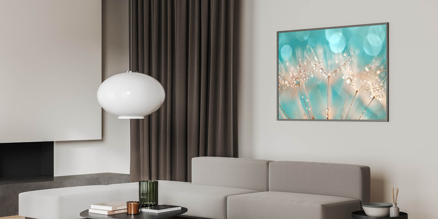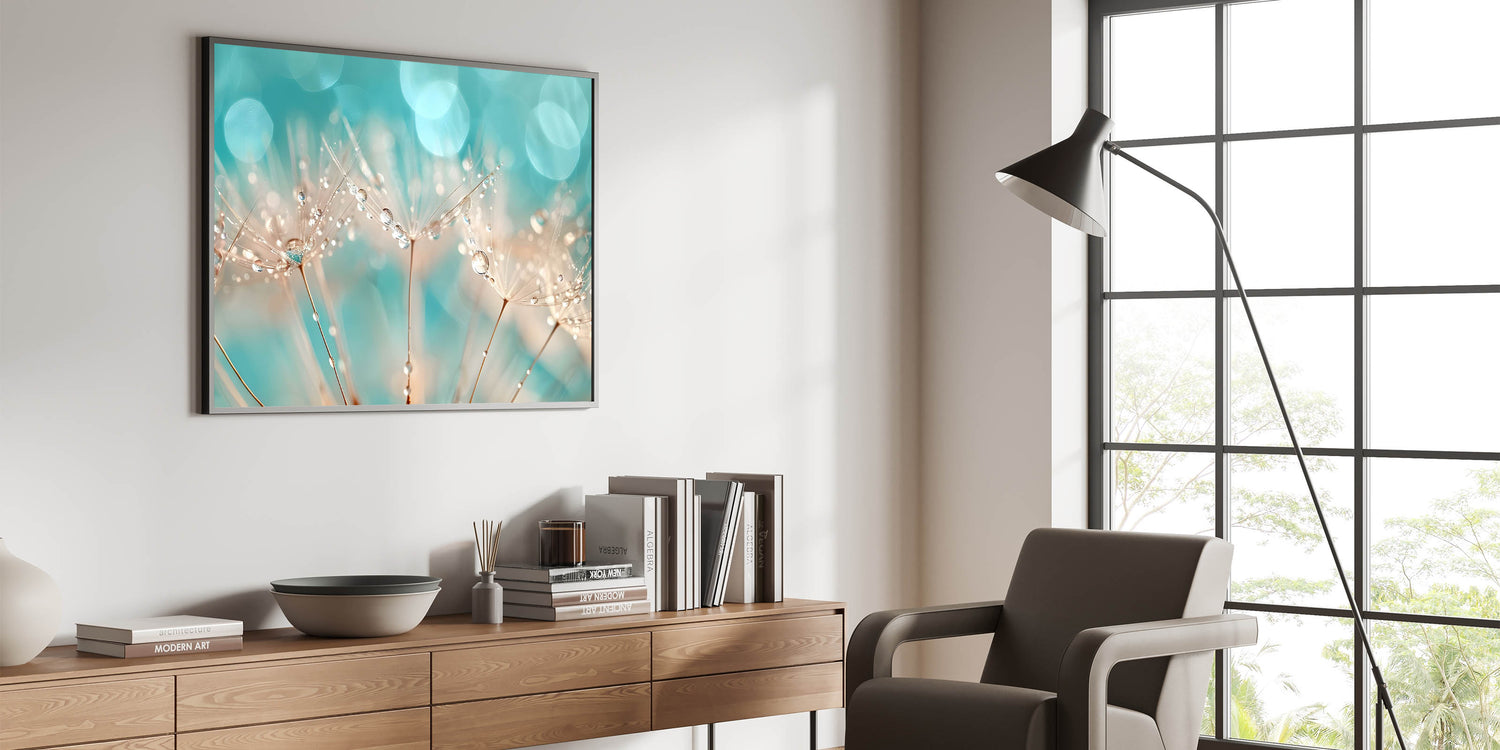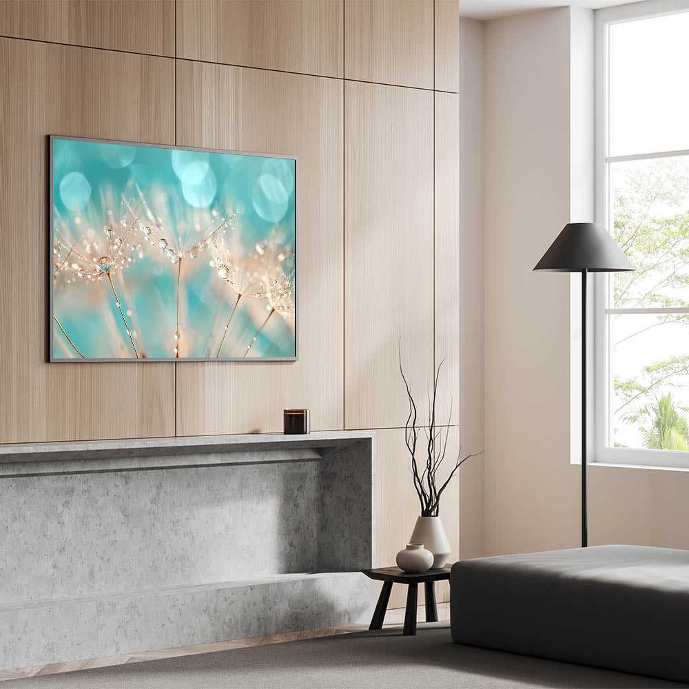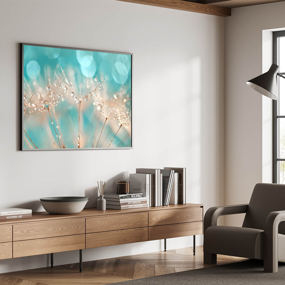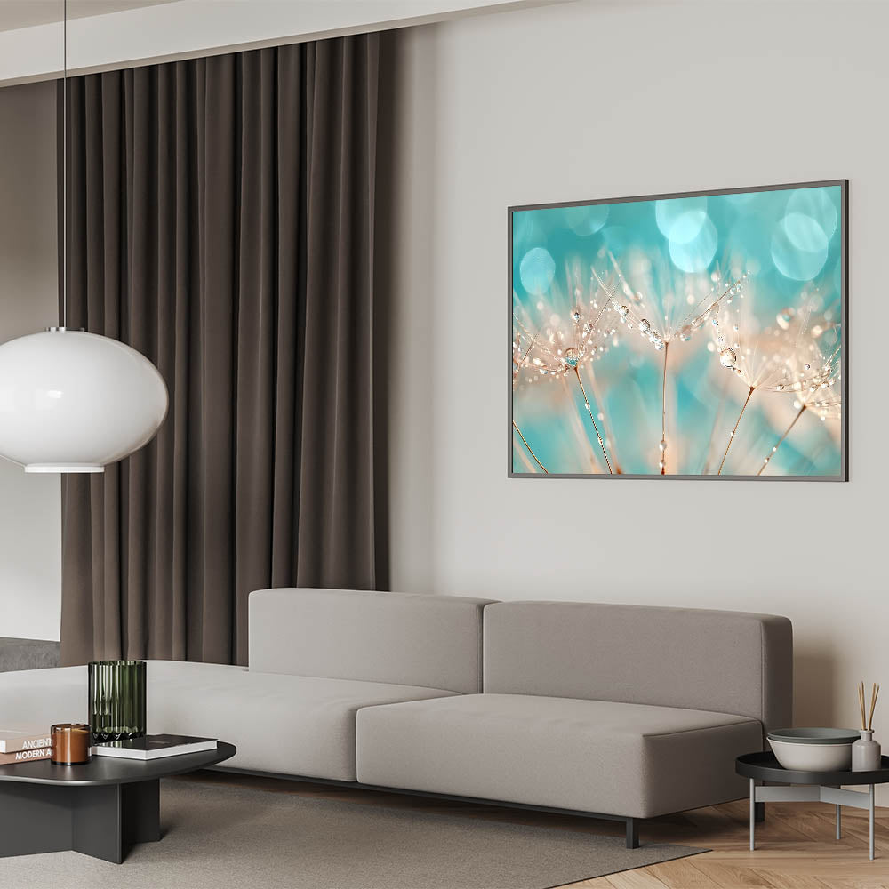 Enhance your living space with the serenity of water-inspired wall art. This stunning nature close-up captures the delicate beauty of water droplets resting on plant seeds, evoking a sense of calm and tranquility. The soft focus and bright blue background bring a peaceful ambiance to any room.