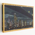Capture the iconic beauty of New York City at night with this Vintage Travel Poster featuring the skyline viewed from under the Brooklyn Bridge. The glowing lights, towering skyscrapers, and deep navy and gold tones create a nostalgic and dramatic scene, making this retro travel print perfect for those who appreciate timeless travel art and classic cityscapes.