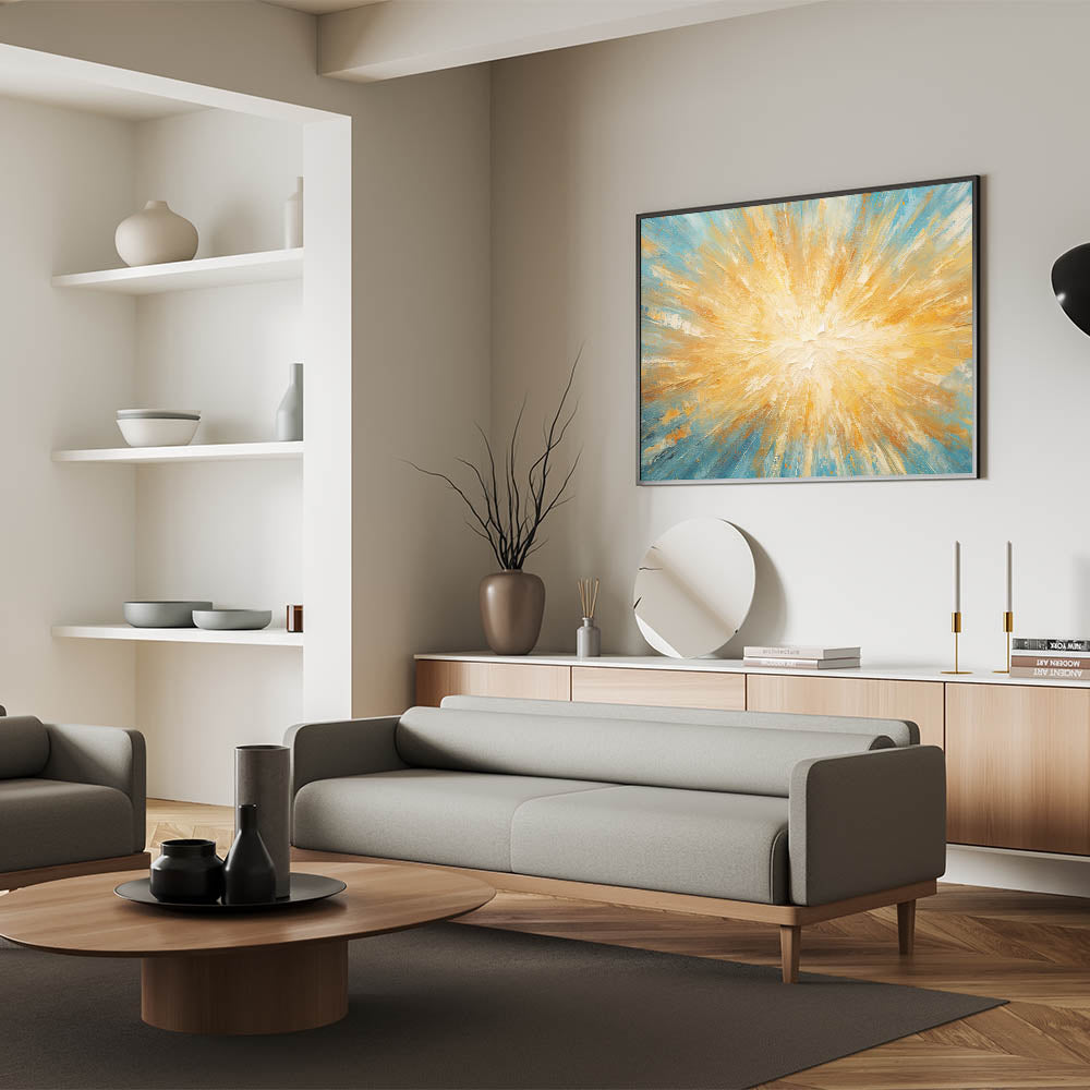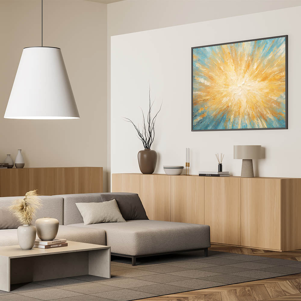Add a dynamic touch to your space with this Stunning Sun Wall Art, featuring an abstract sunburst in vibrant shades of gold and blue. The bold brushstrokes radiate from the center, creating an energetic effect that captures the powerful energy of the sun. The artwork beautifully blends warm yellows, golds, and oranges with cool blues, creating a striking contrast and a sense of movement. This Space-Themed Sun Print is perfect for adding a modern, abstract flair to any room, making it an eye-catching centerpiece in any setting.