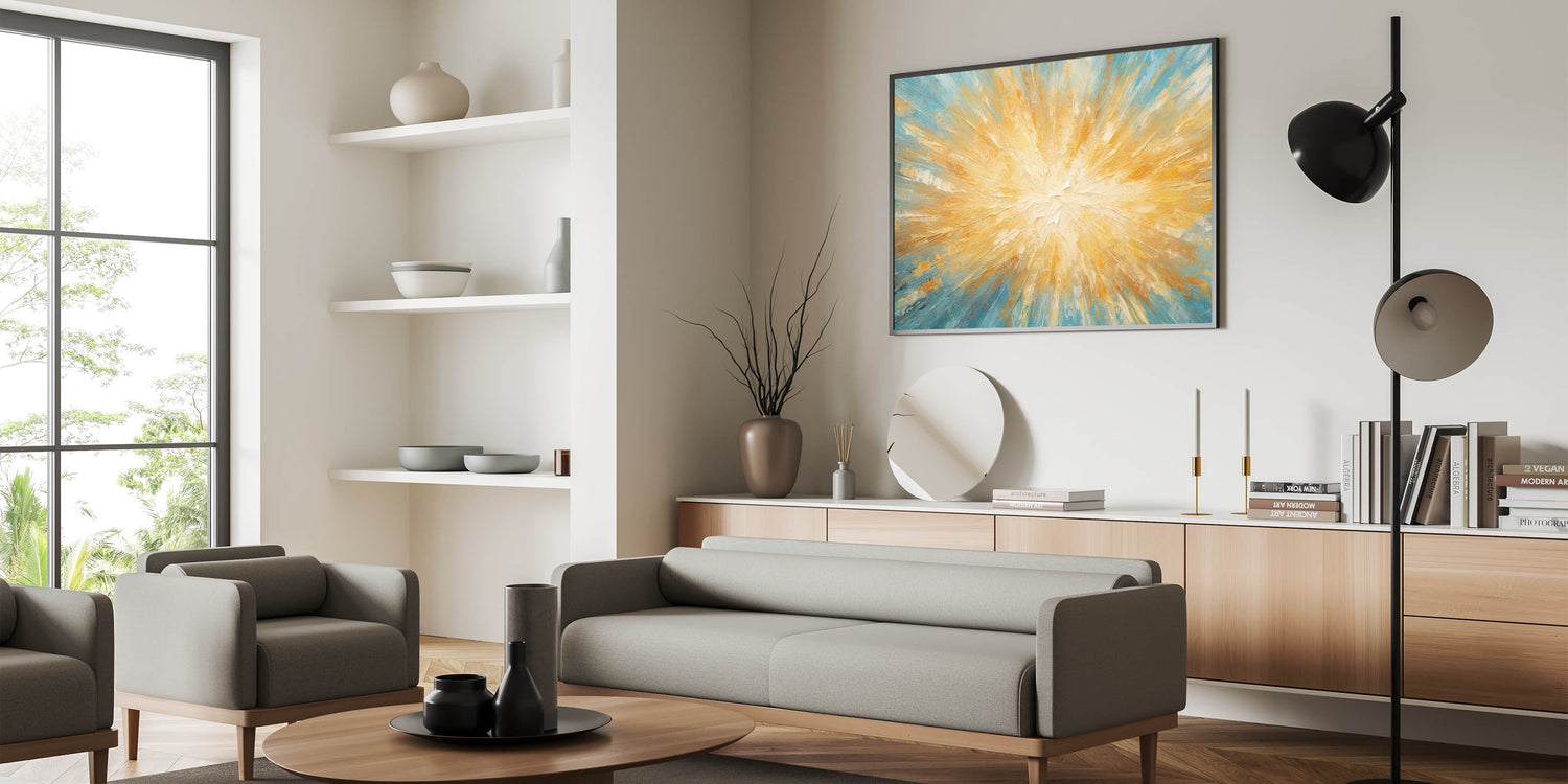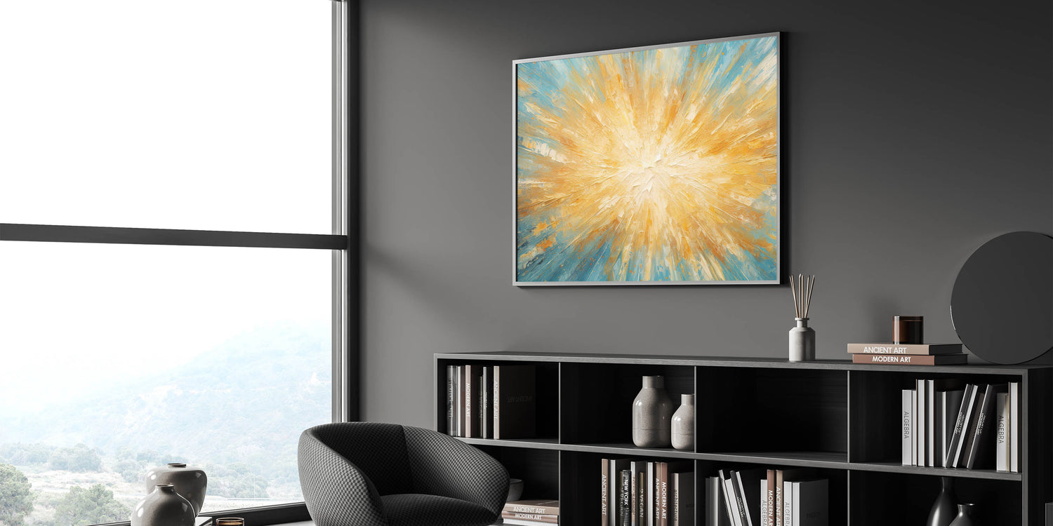 Radiant Sunburst Explosion – Abstract Sun Wall Art with Gold and Blue