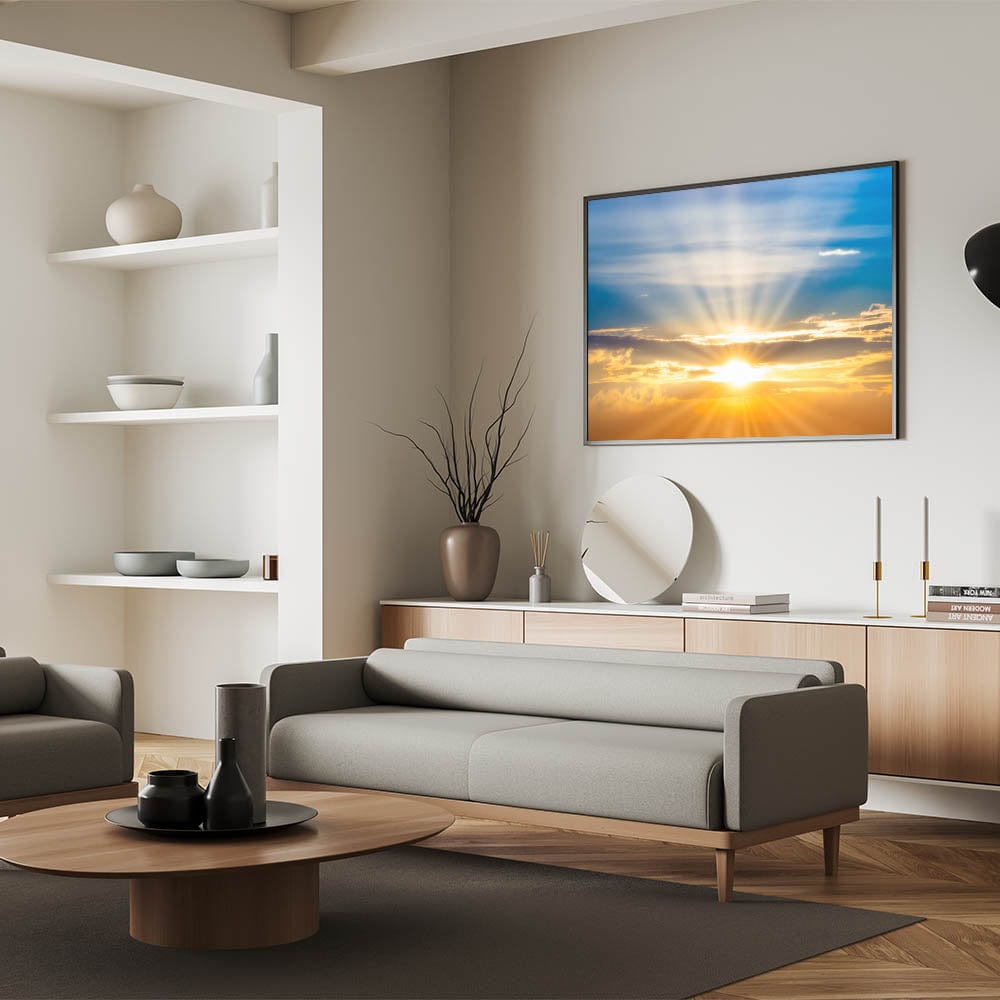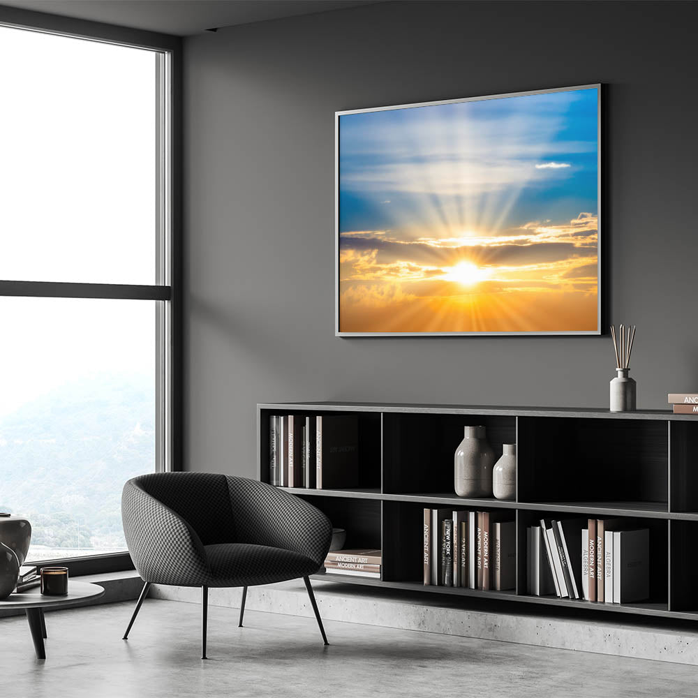 Radiant Sunrise Over Horizon – Peaceful Sun Wall Art with Blue Skies