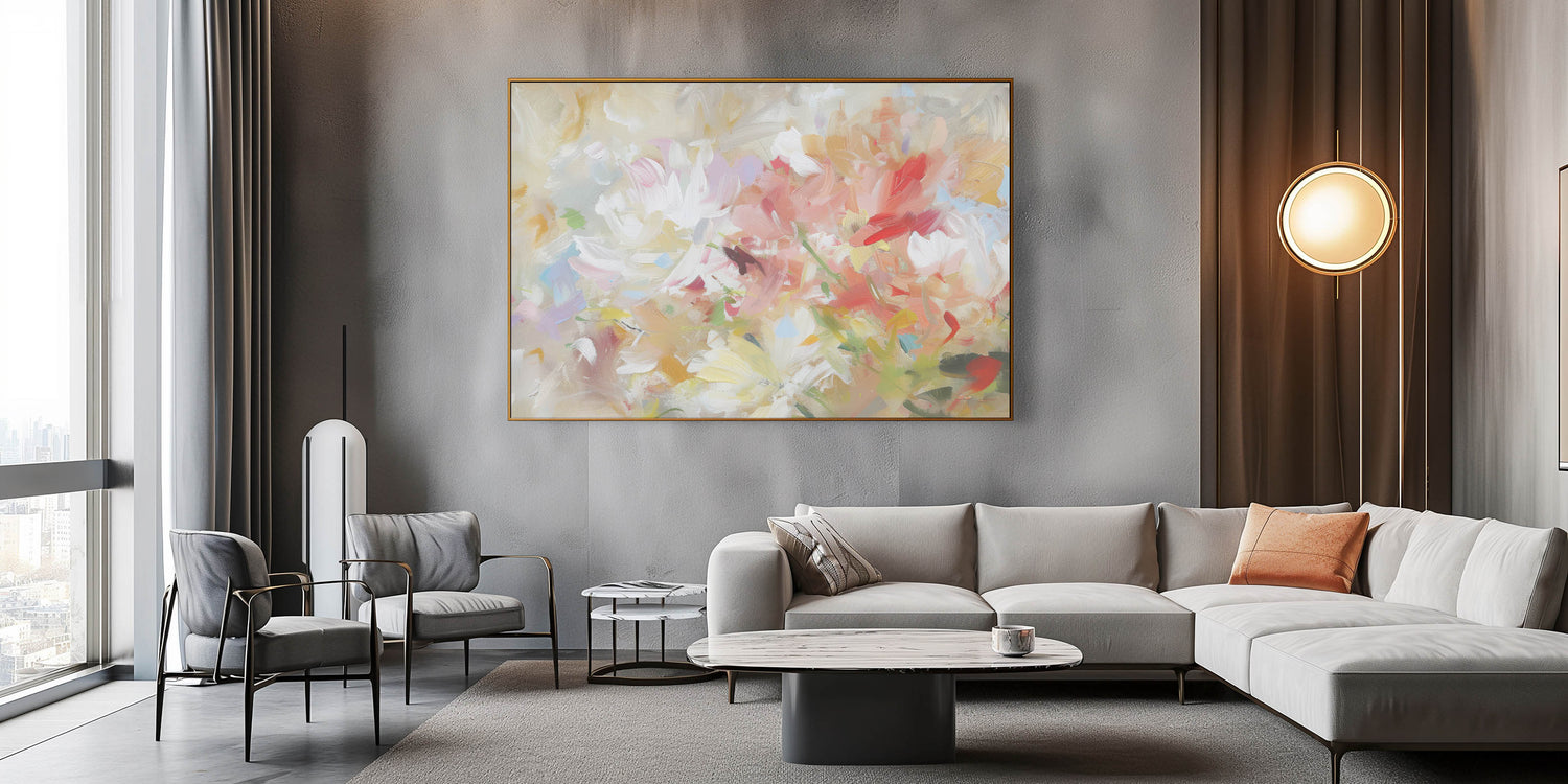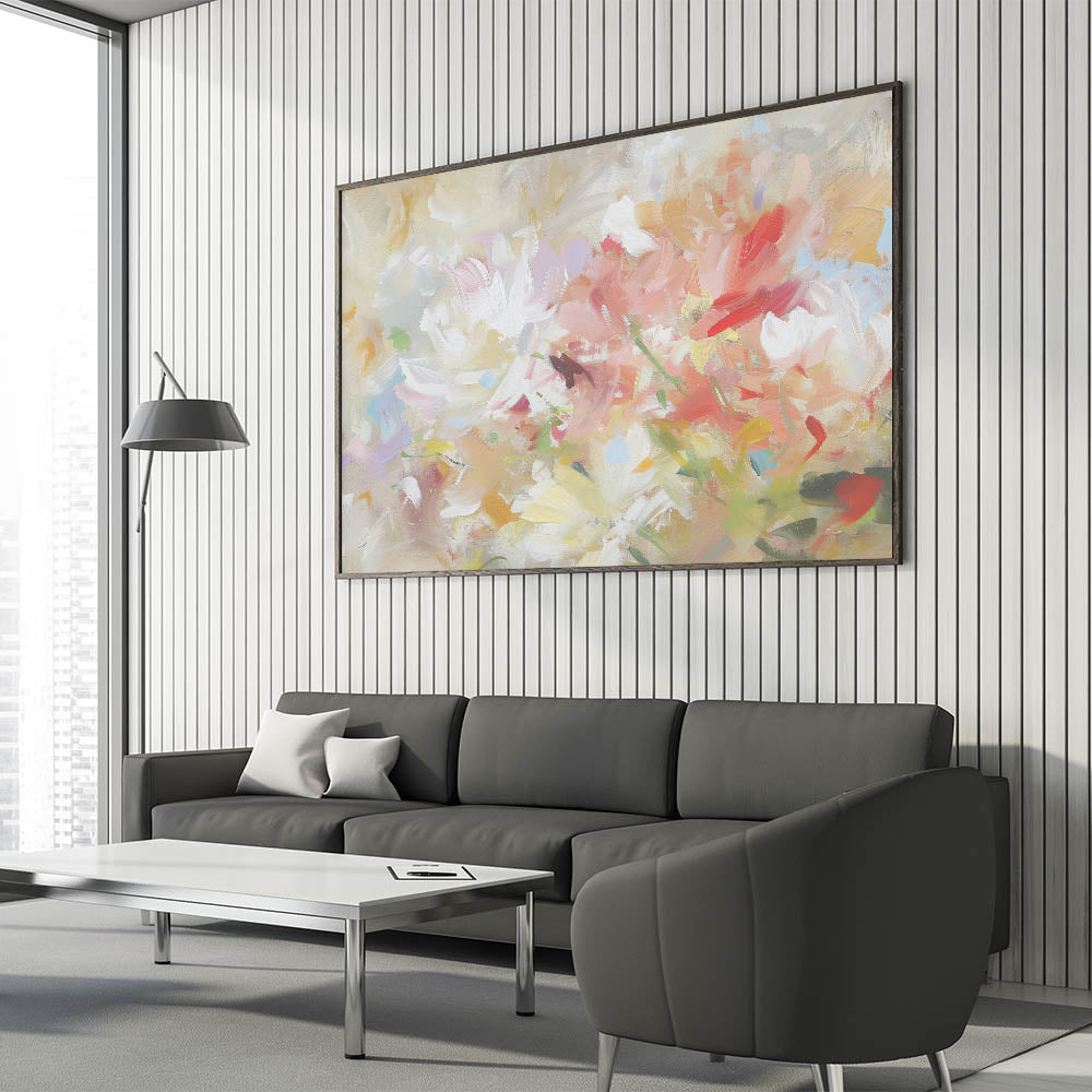 Brighten your space with this vibrant abstract floral artwork, a celebration of color and movement. Featuring a lively composition of soft pastels, bold reds, and subtle greens, this piece captures the essence of a blooming garden in an artistic and modern style. The dynamic brushstrokes and vibrant hues make it a perfect centerpiece for living rooms, dining areas, or workspaces, bringing energy and charm to any setting.