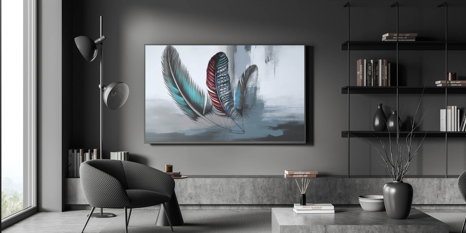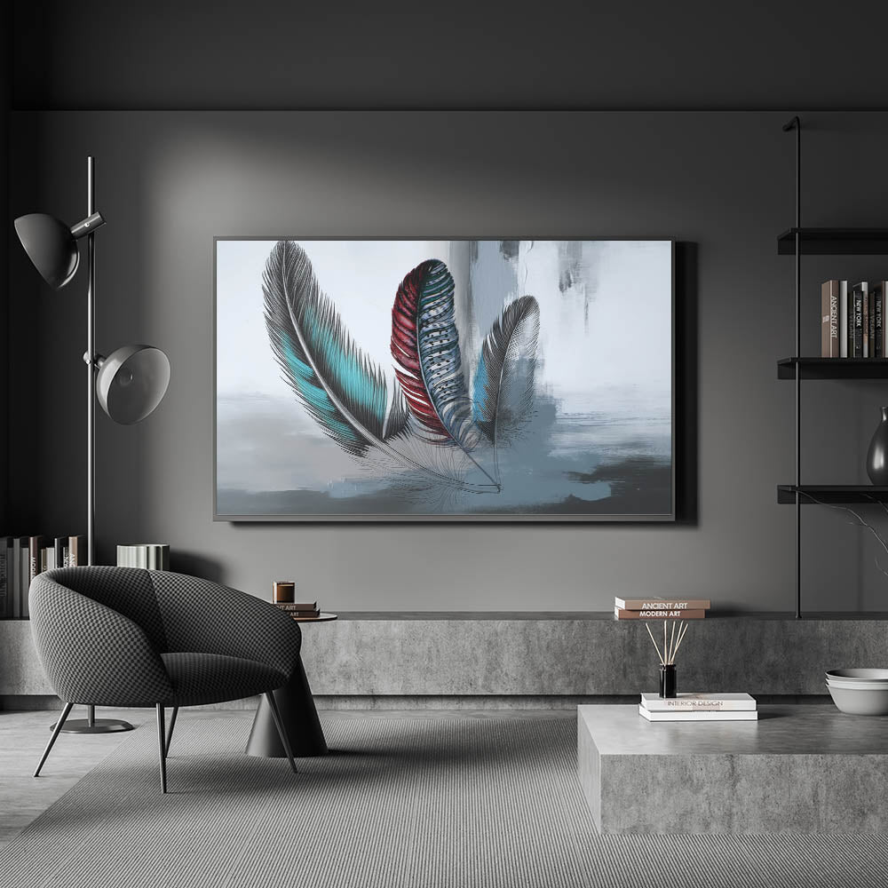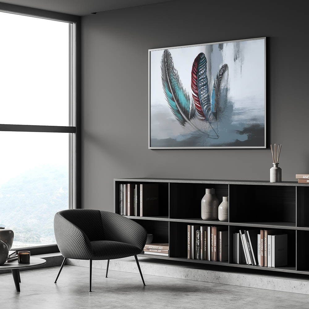 Add a splash of vibrancy to your space with this dynamic feather line abstract art. The blend of deep reds, rich blues, and subtle teal tones against a cool, neutral background creates a striking contrast that captivates the eye. This contemporary geometric canvas is perfect for modern interiors, bringing both energy and elegance to any room.
