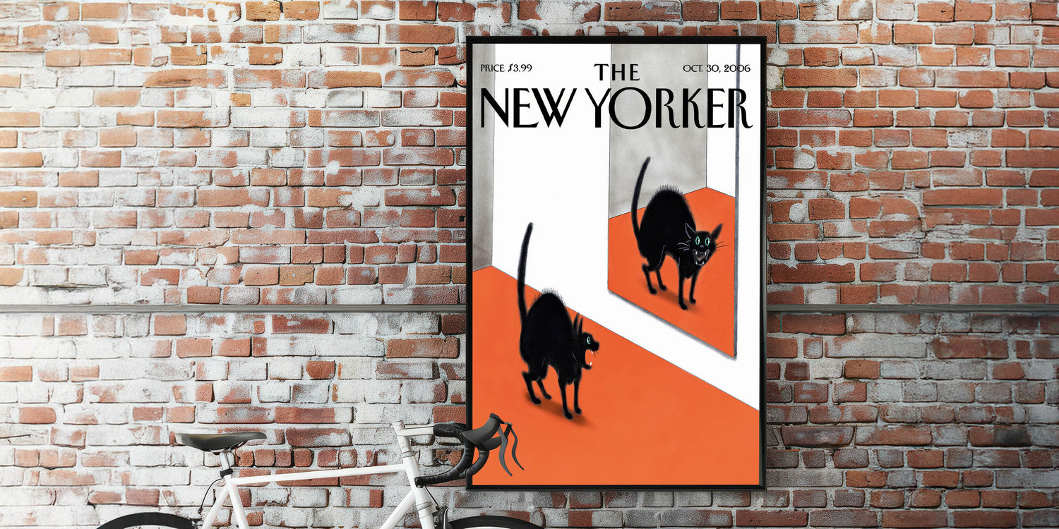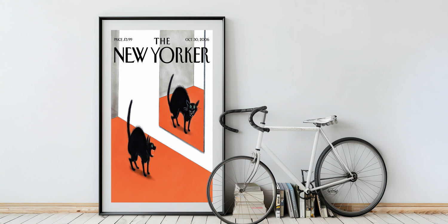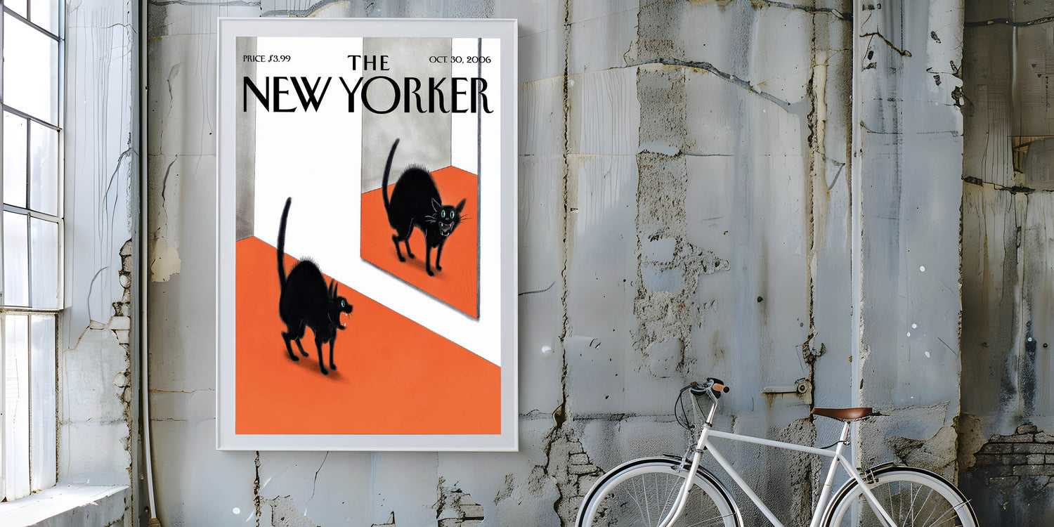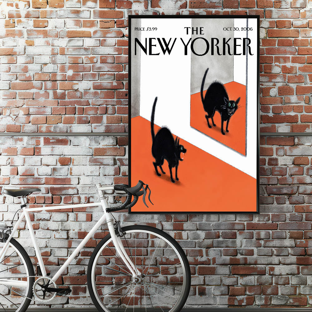 This iconic New Yorker Poster from October 30, 2006, features a playful and eerie scene of a black cat encountering its own reflection in a mirror. The cat’s vibrant, glowing eyes and puffed-up fur add a touch of humor and mystery to the artwork. The contrast of the deep black of the cat against the bold orange floor creates a striking visual impact. The surreal nature of the image makes it a perfect piece for adding intrigue and personality to your home, especially for fans of whimsical and quirky designs.